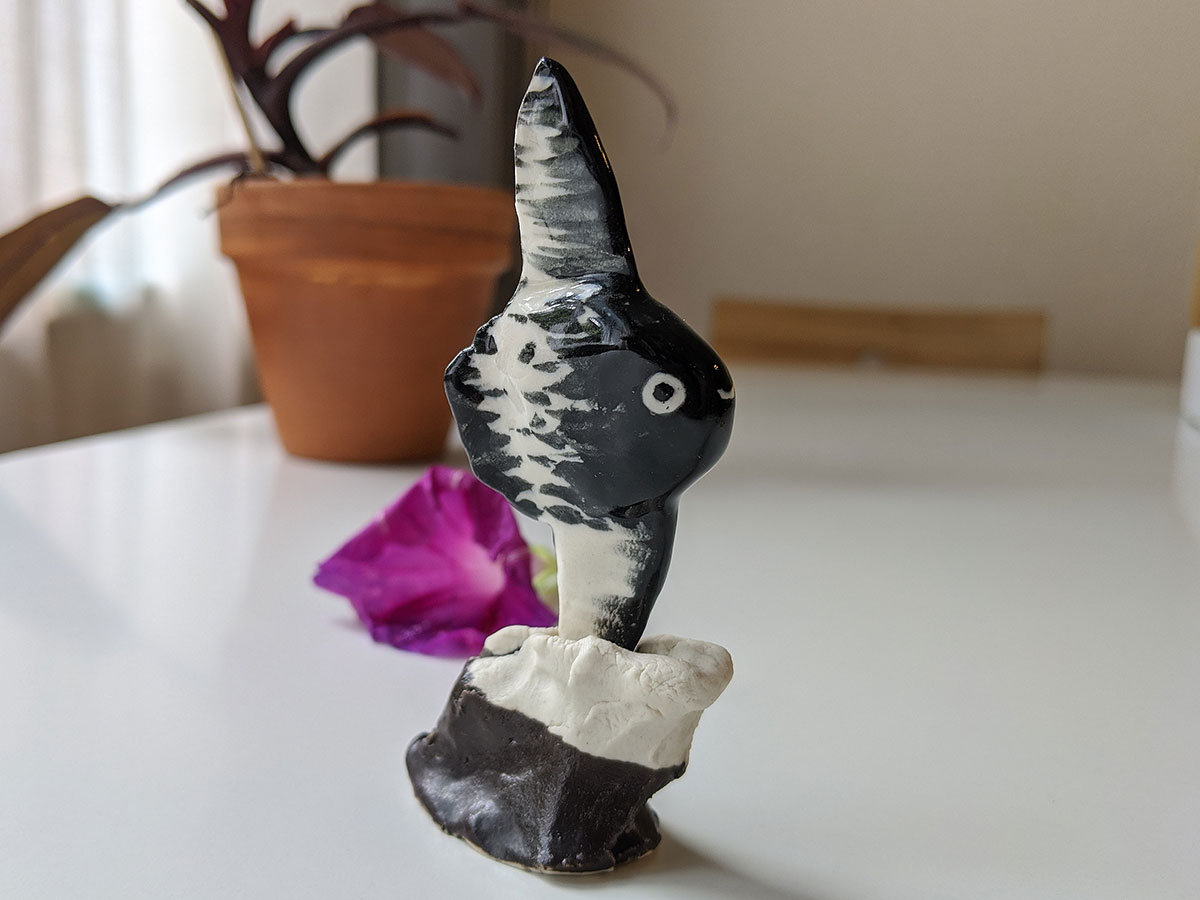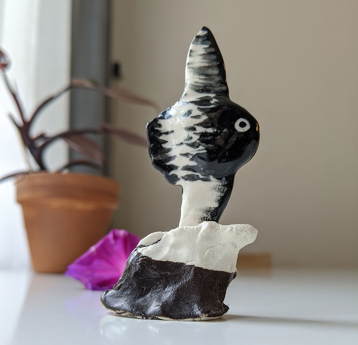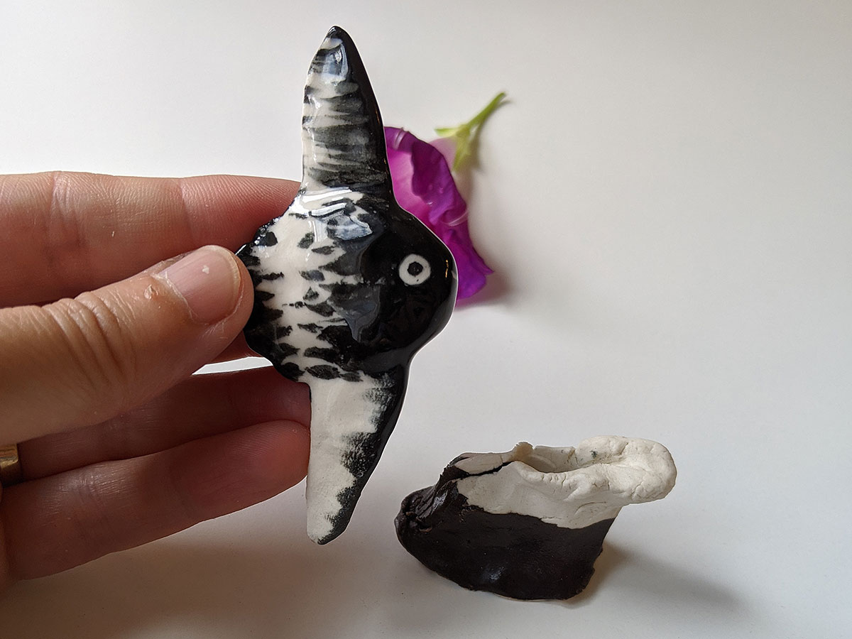 C’est le deuxième poisson lune que j’ai créé, en porcelaine blanche émaillée avec détails noirs. Il se détache de sa base. Si bien que tu peux cacher la base dans un pot de plantes et avoir juste le poisson qui dépasse 🙂 Pièce unique, envoi inclus hors suivi.