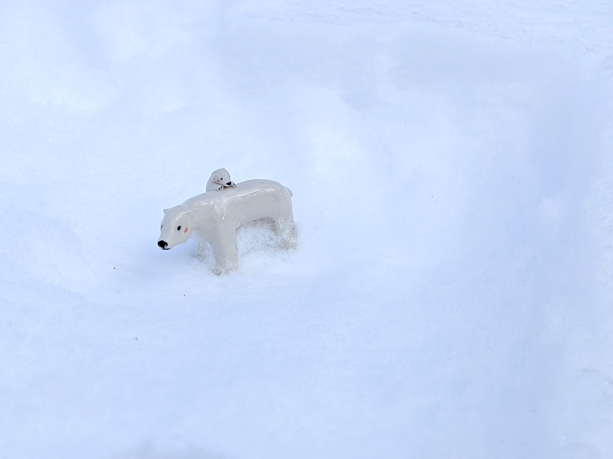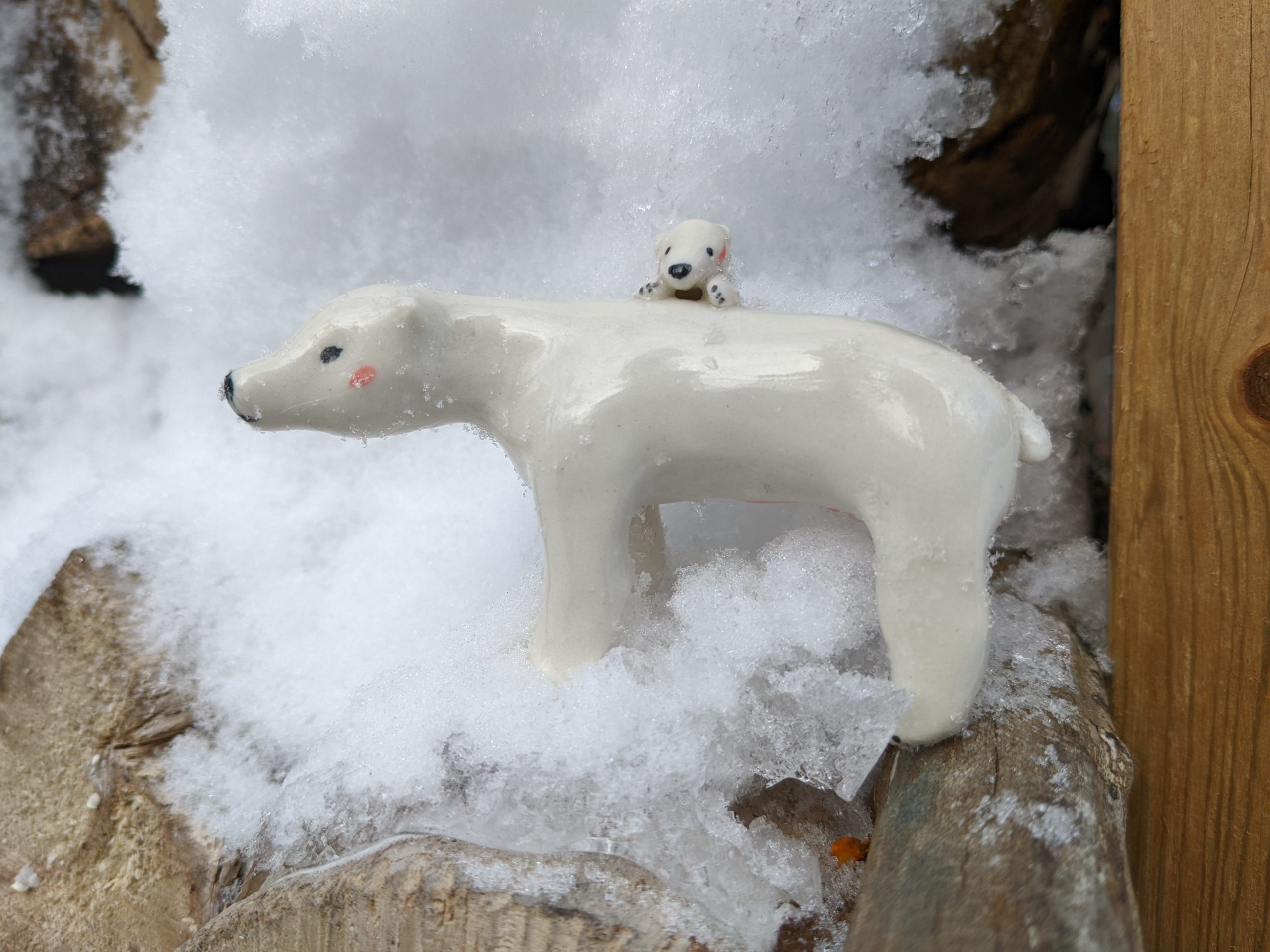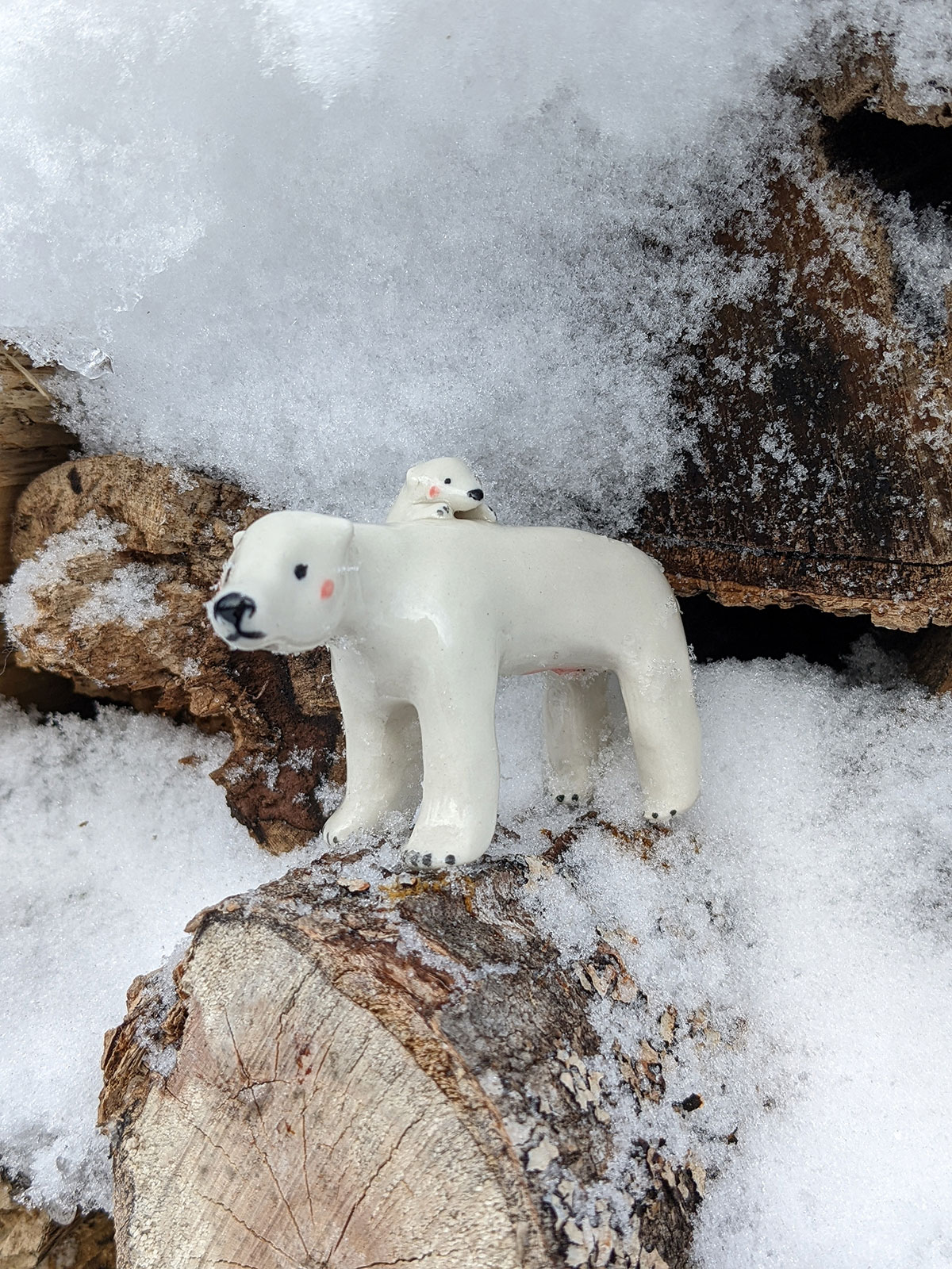 Polar bear mama and a cub, porcelain figurine. One of a kind handcrafted ceramics miniature. About 8 cm long.