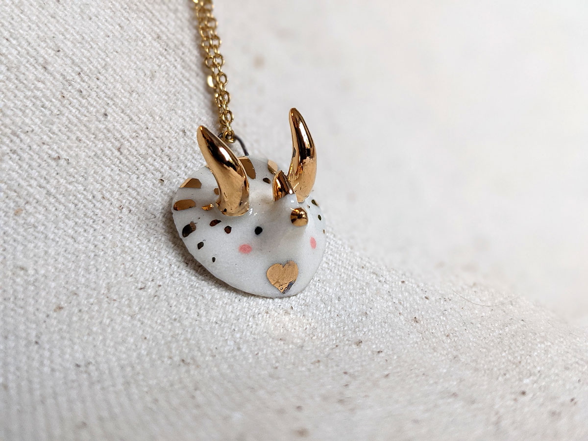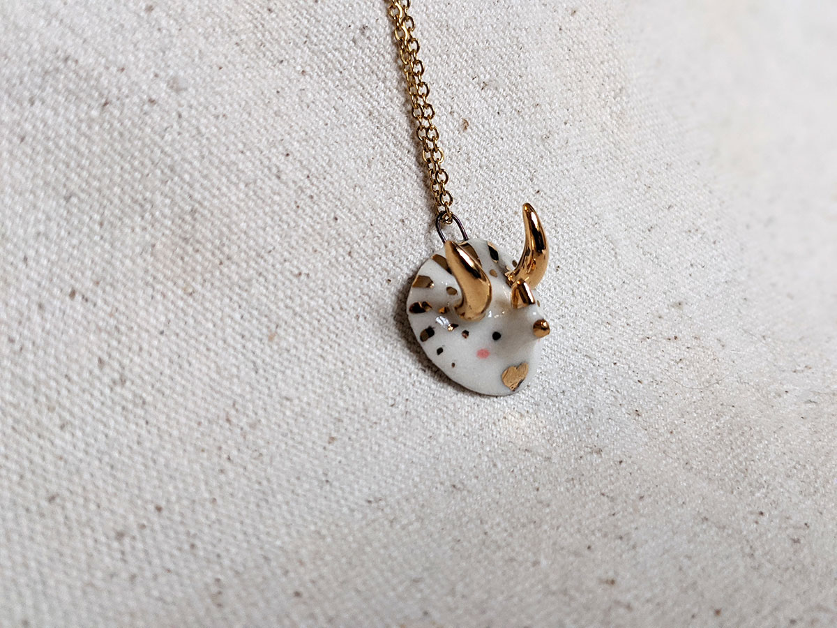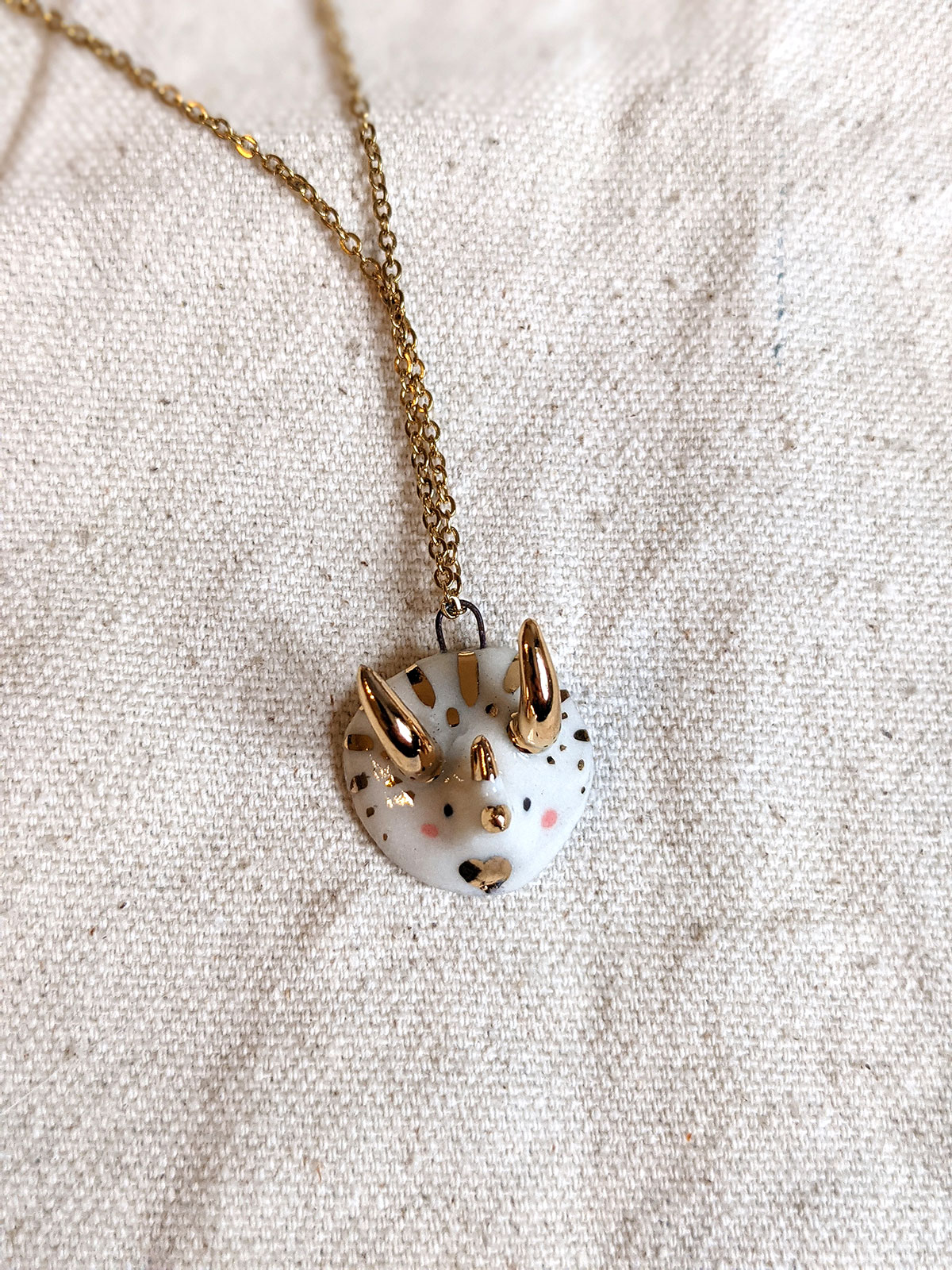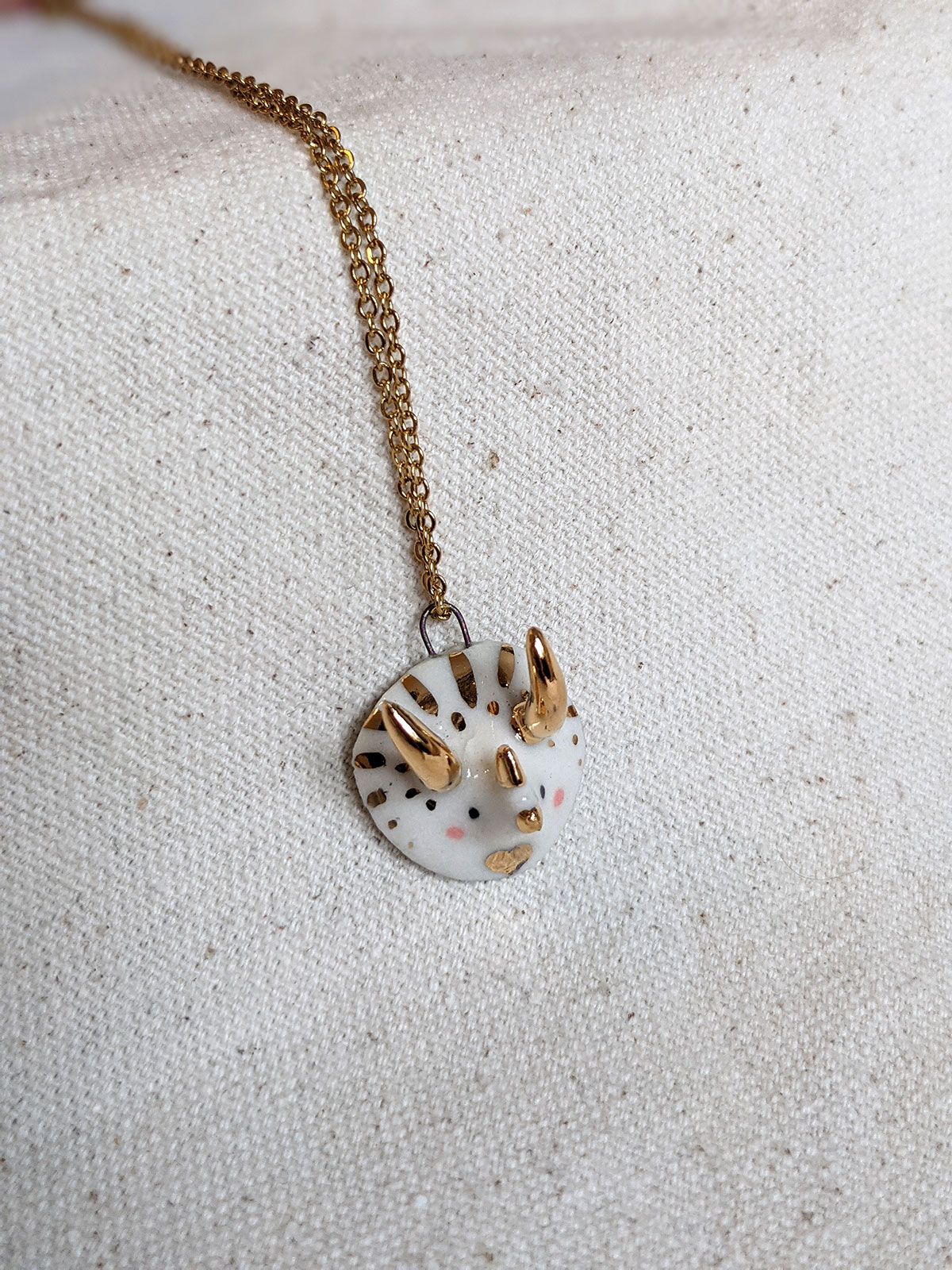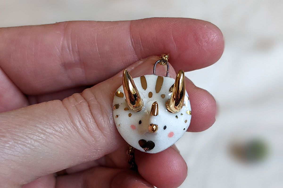 Small handcrafted triceratops pendant with gold luster over glazed porcelain.