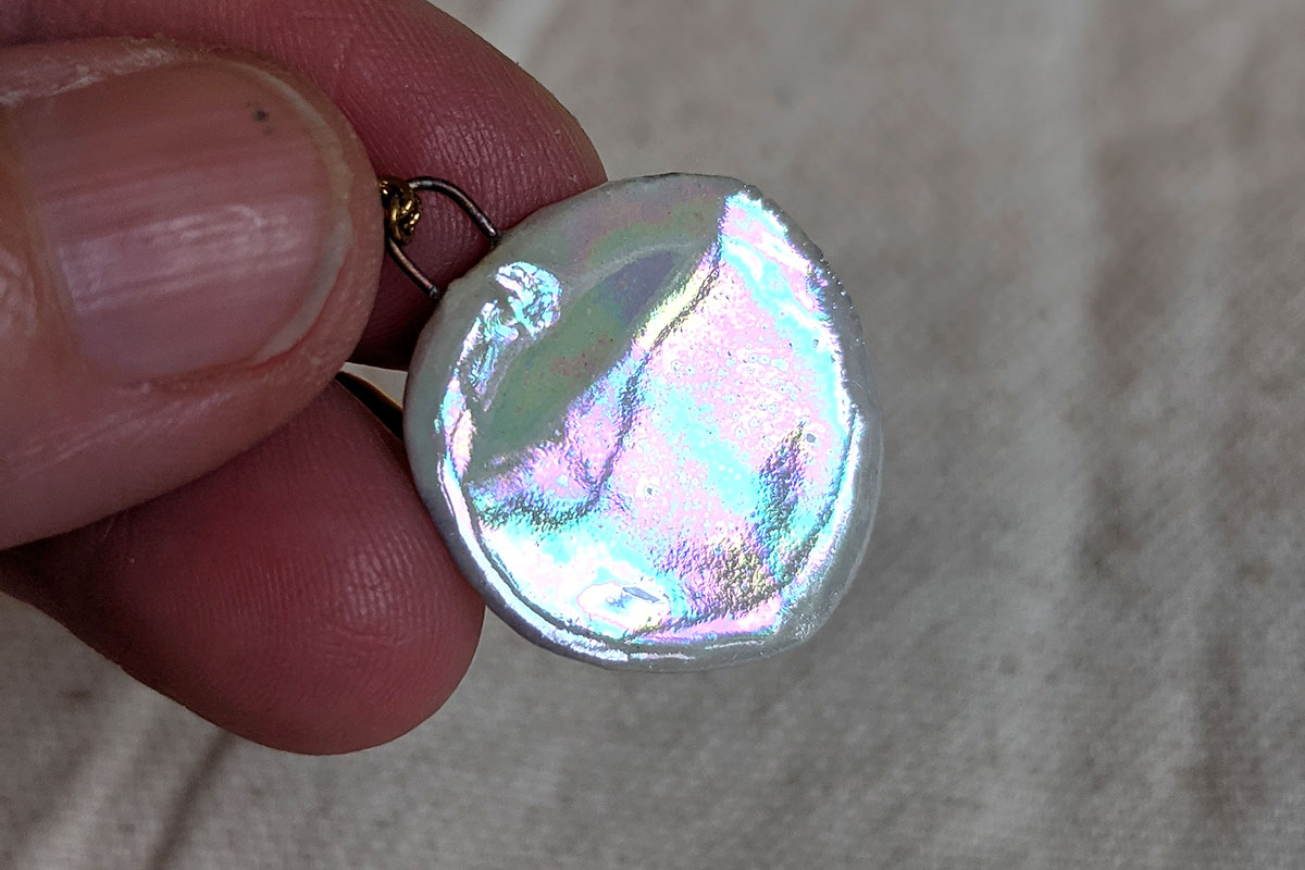 The back is coated in mother of pearl and the bottom of the pendant is adorned with a little golden heart.
