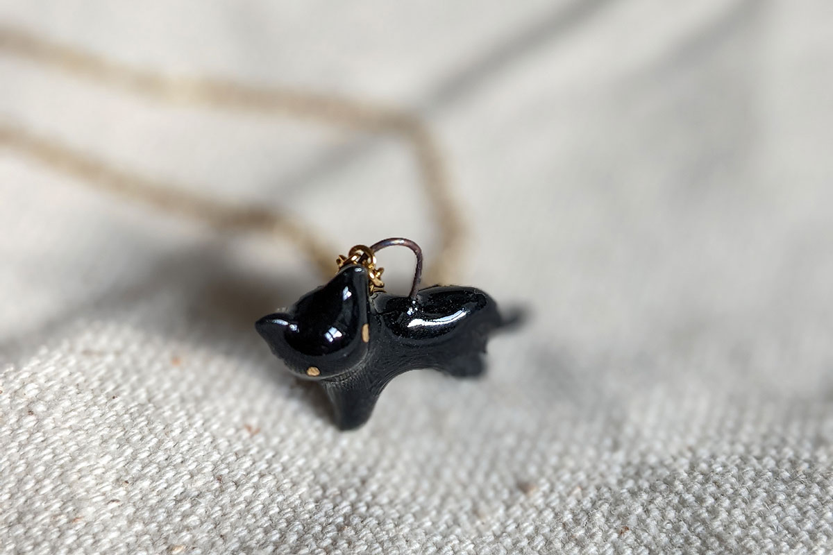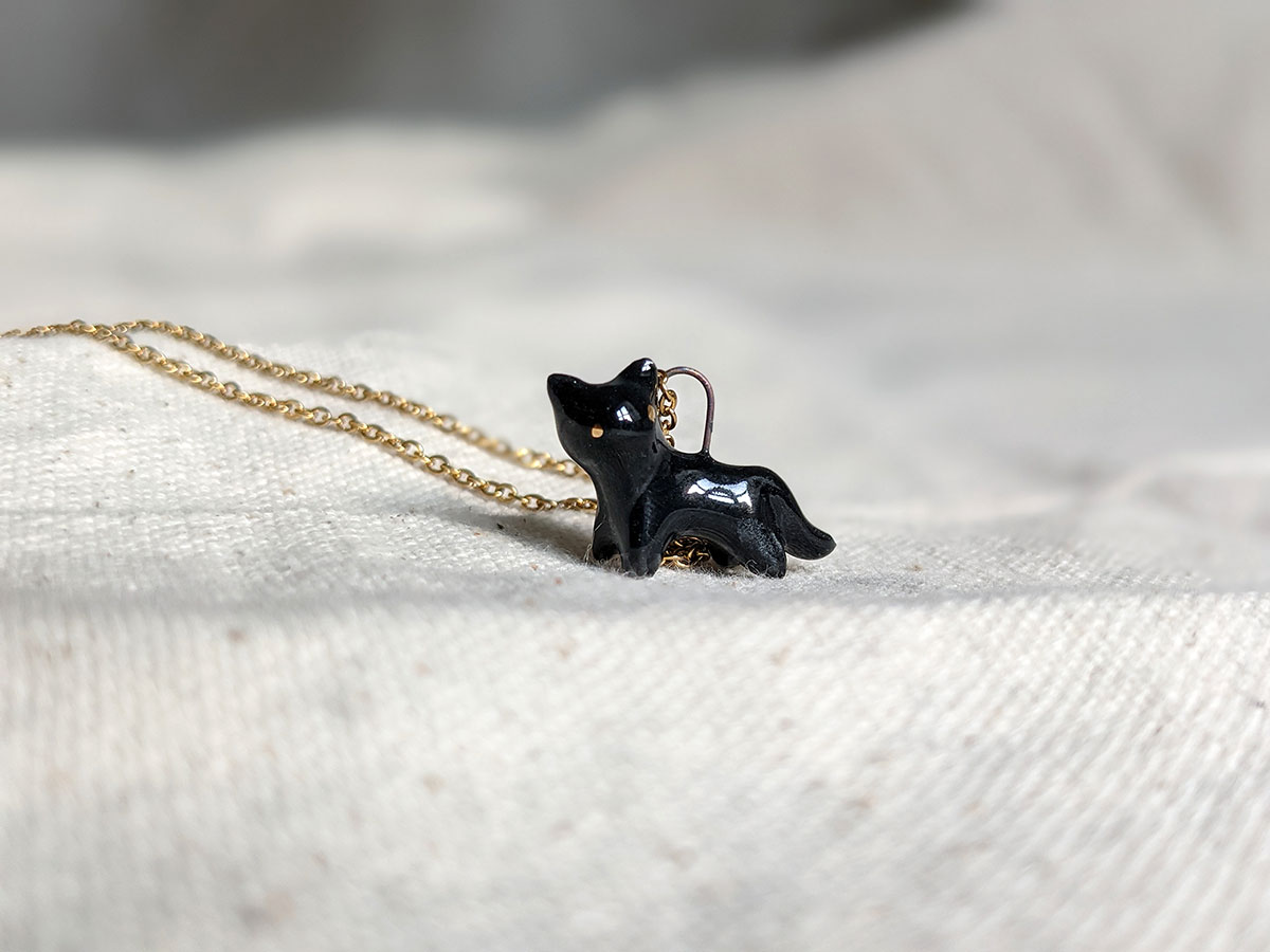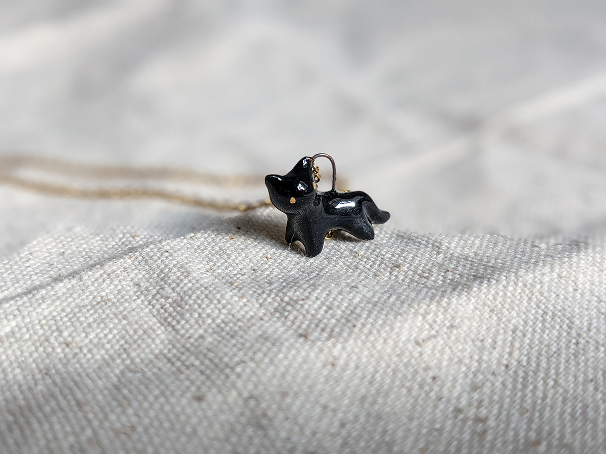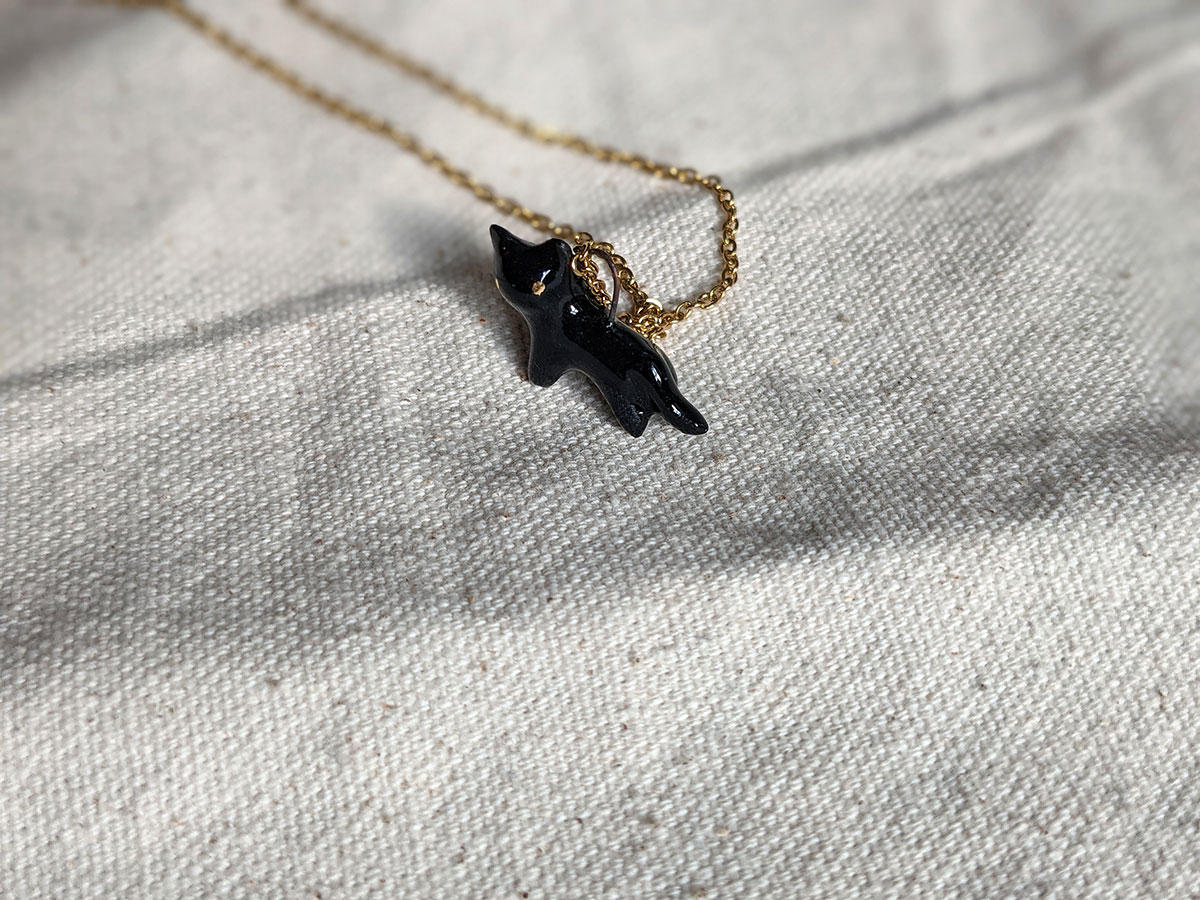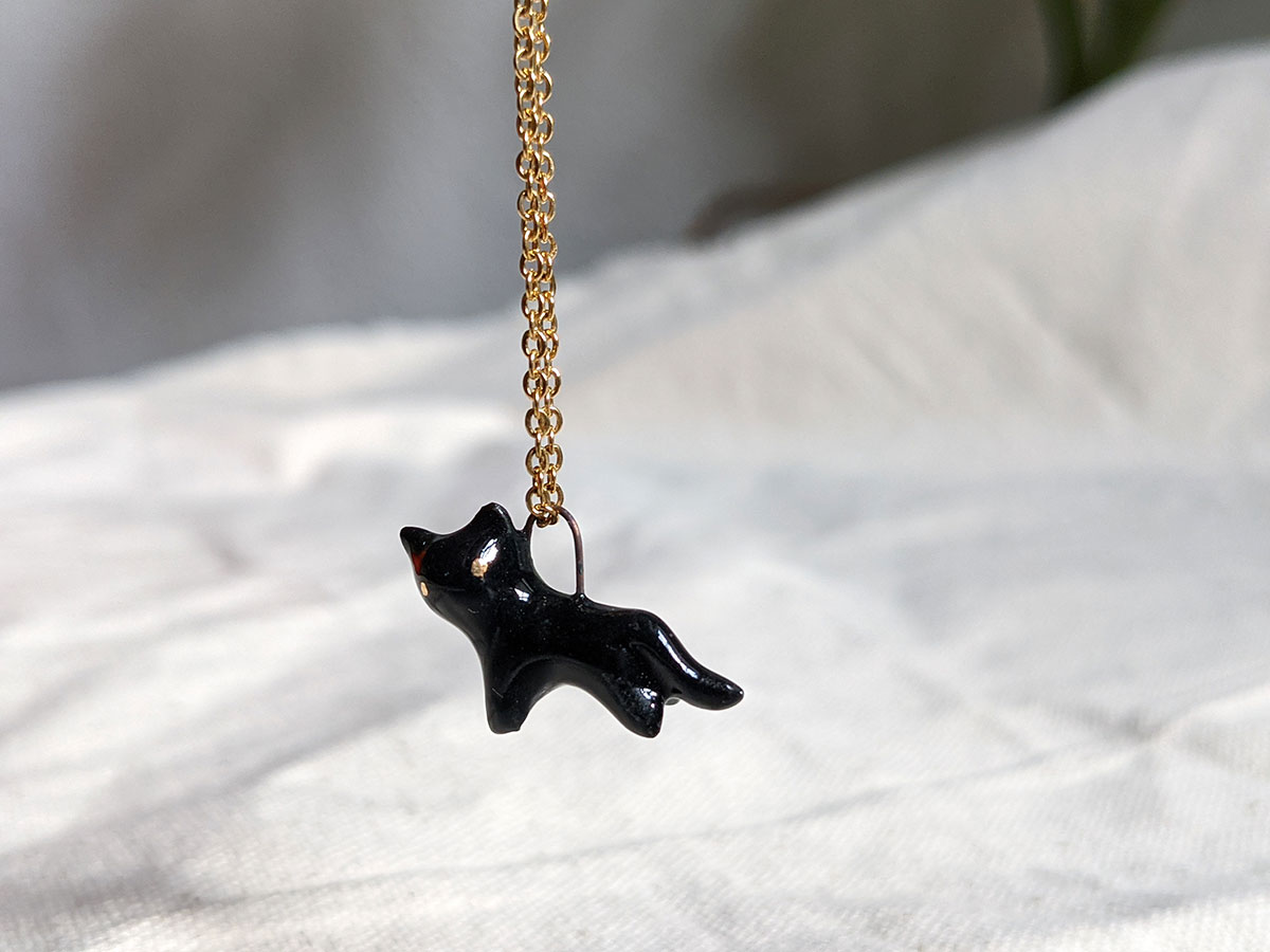 Small black cat pendant in porcelain with fine gold eyes. Nothing more. Chain sold separately, this one of a kind piece of jewelry is handmade in Québec.