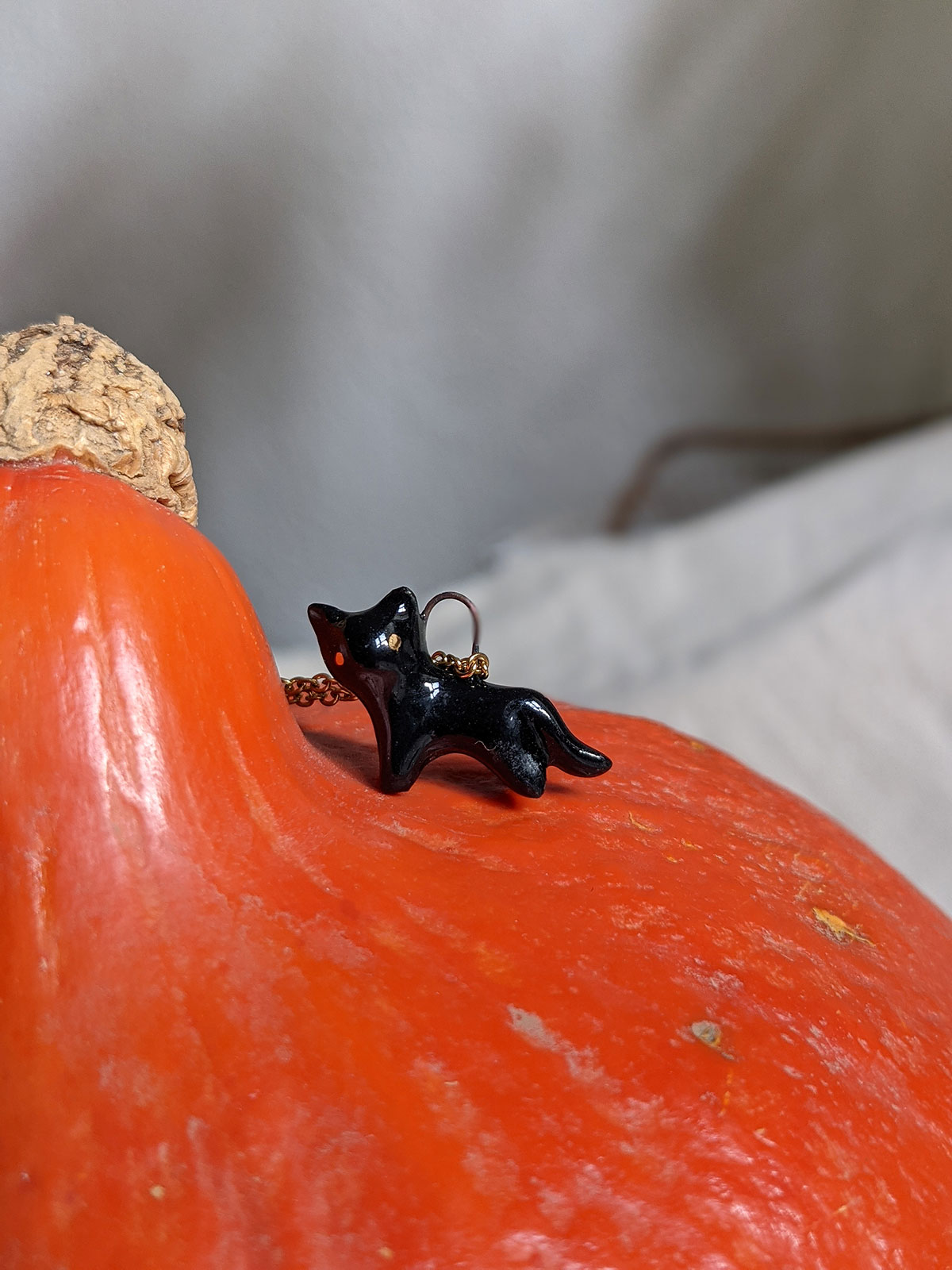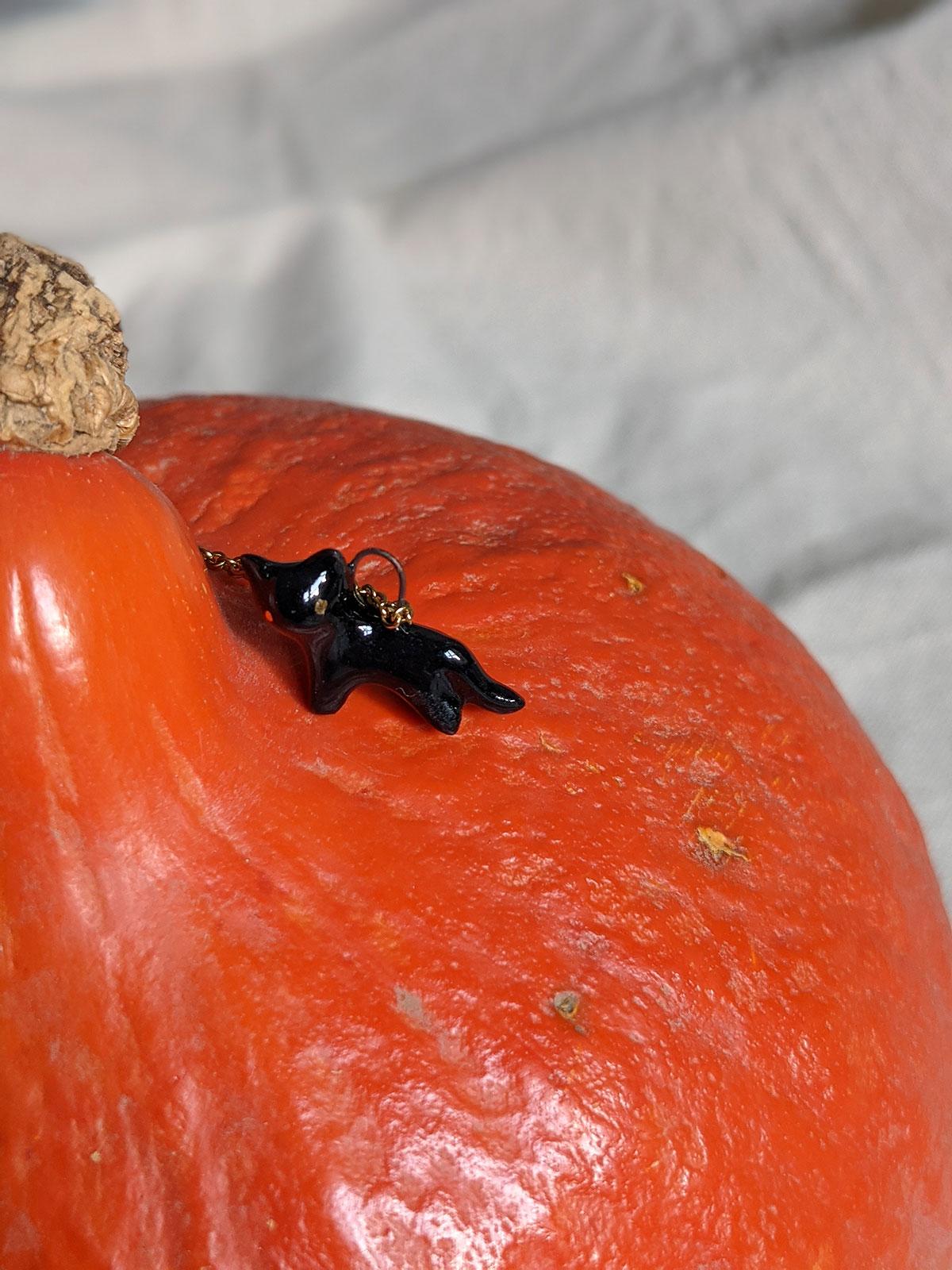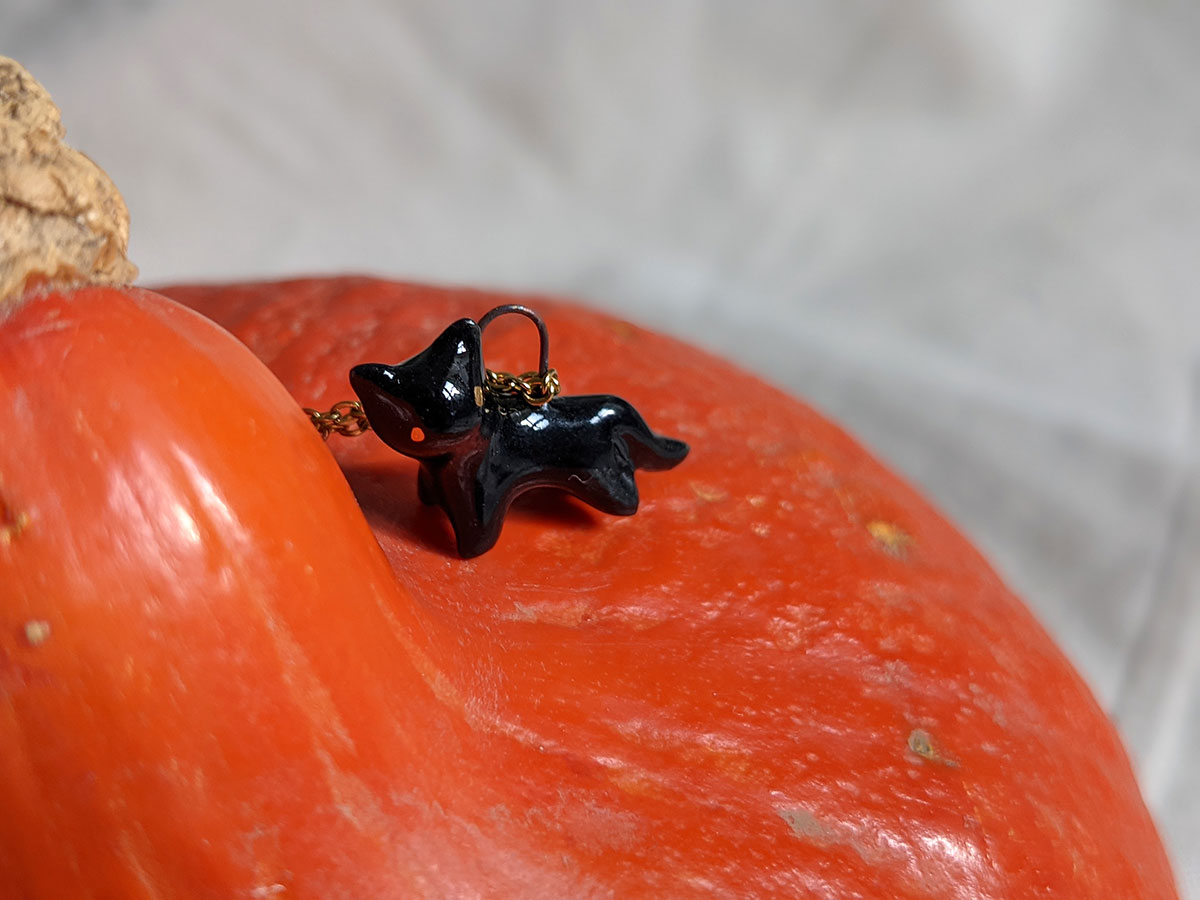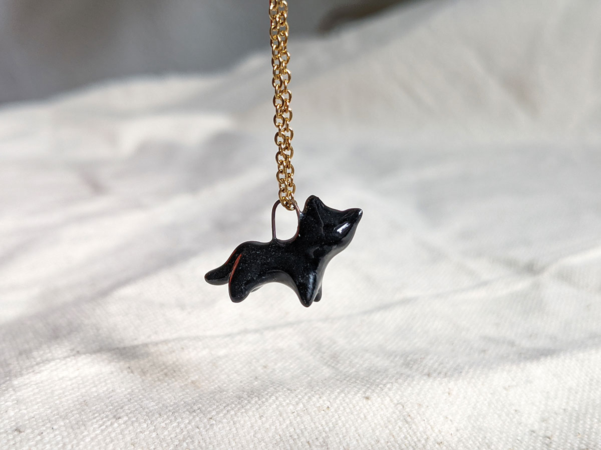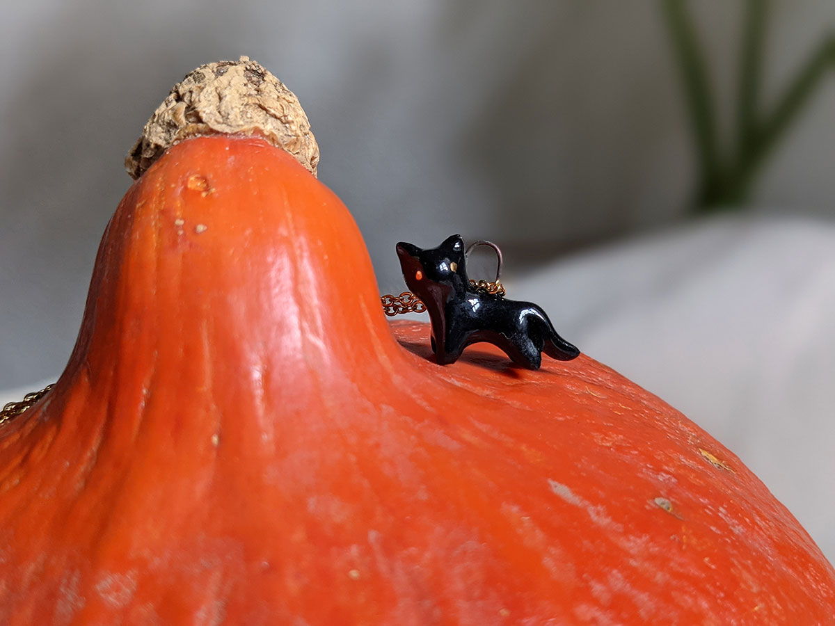 Small black cat pendant in porcelain with fine gold eyes. Nothing more. Chain sold separately, this one of a kind piece of jewelry is handmade in Québec.