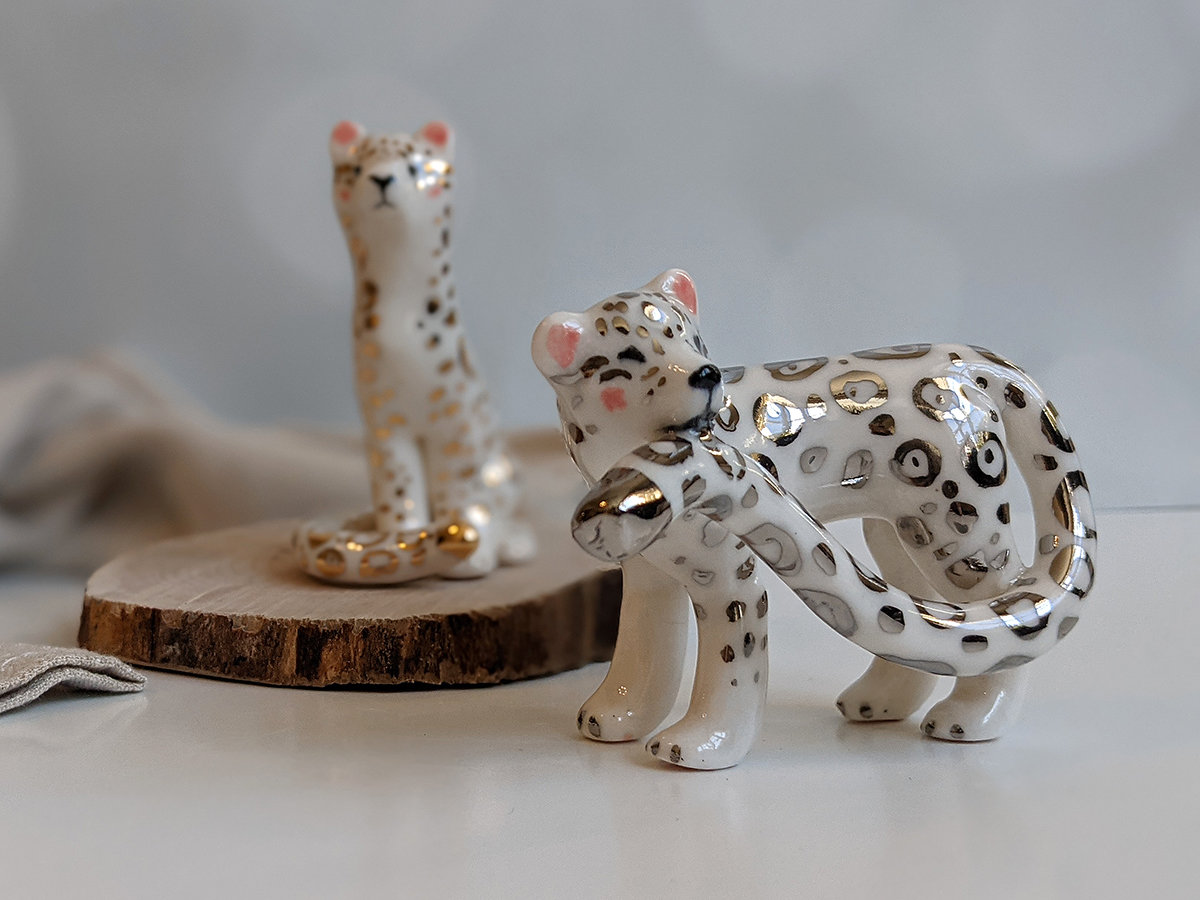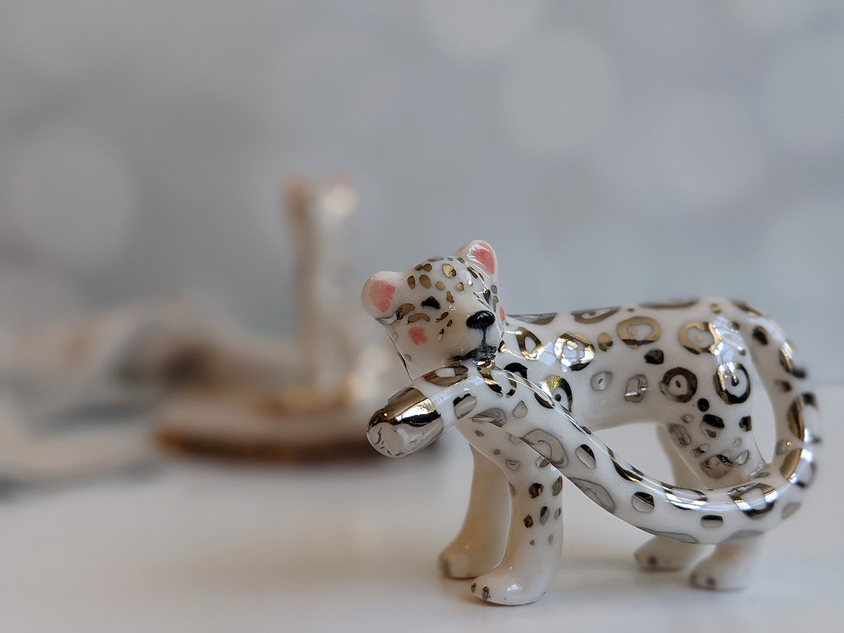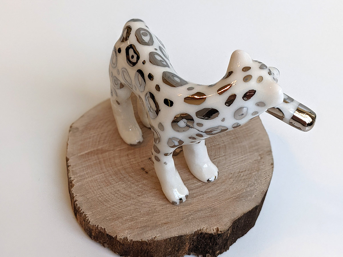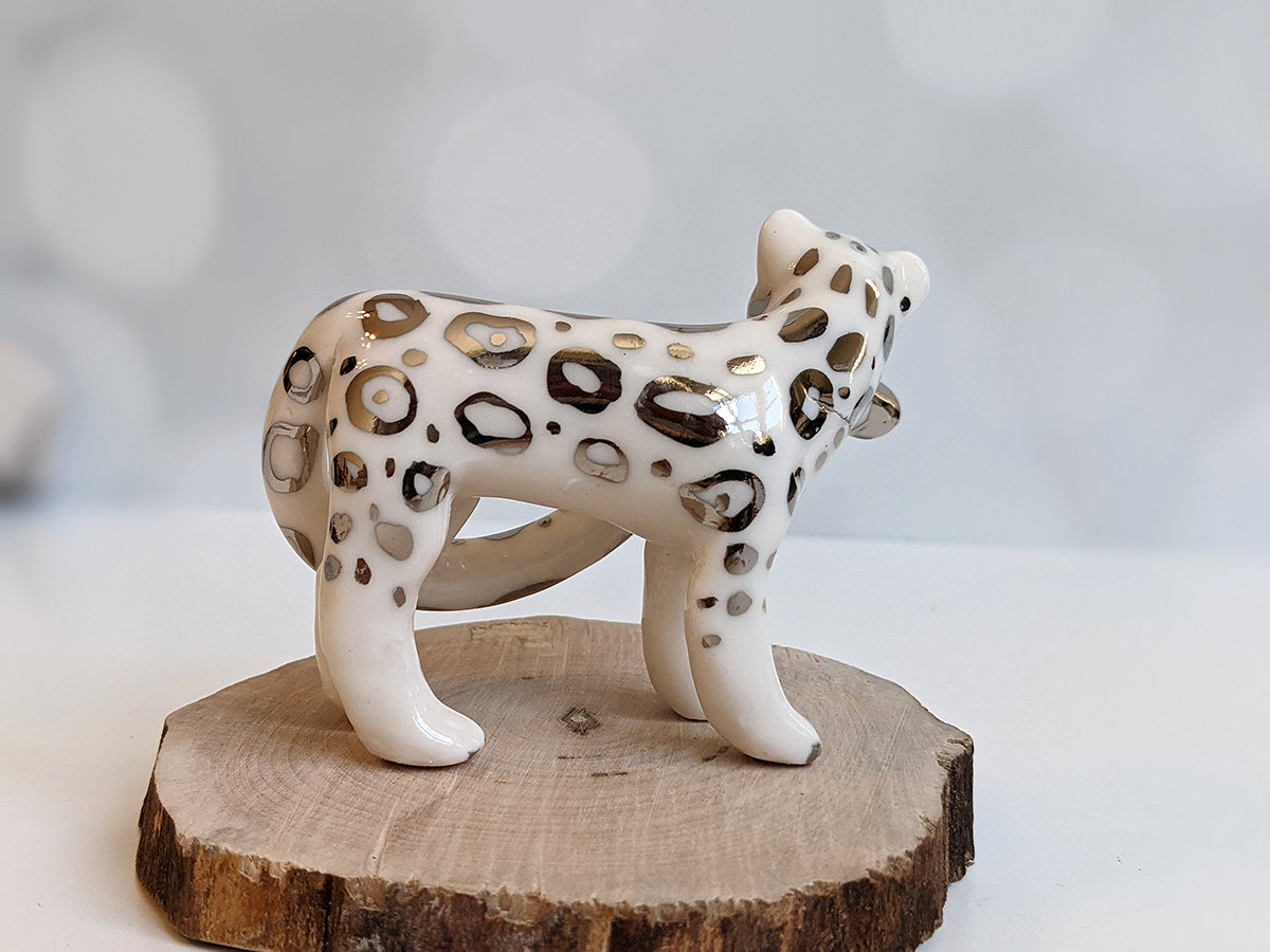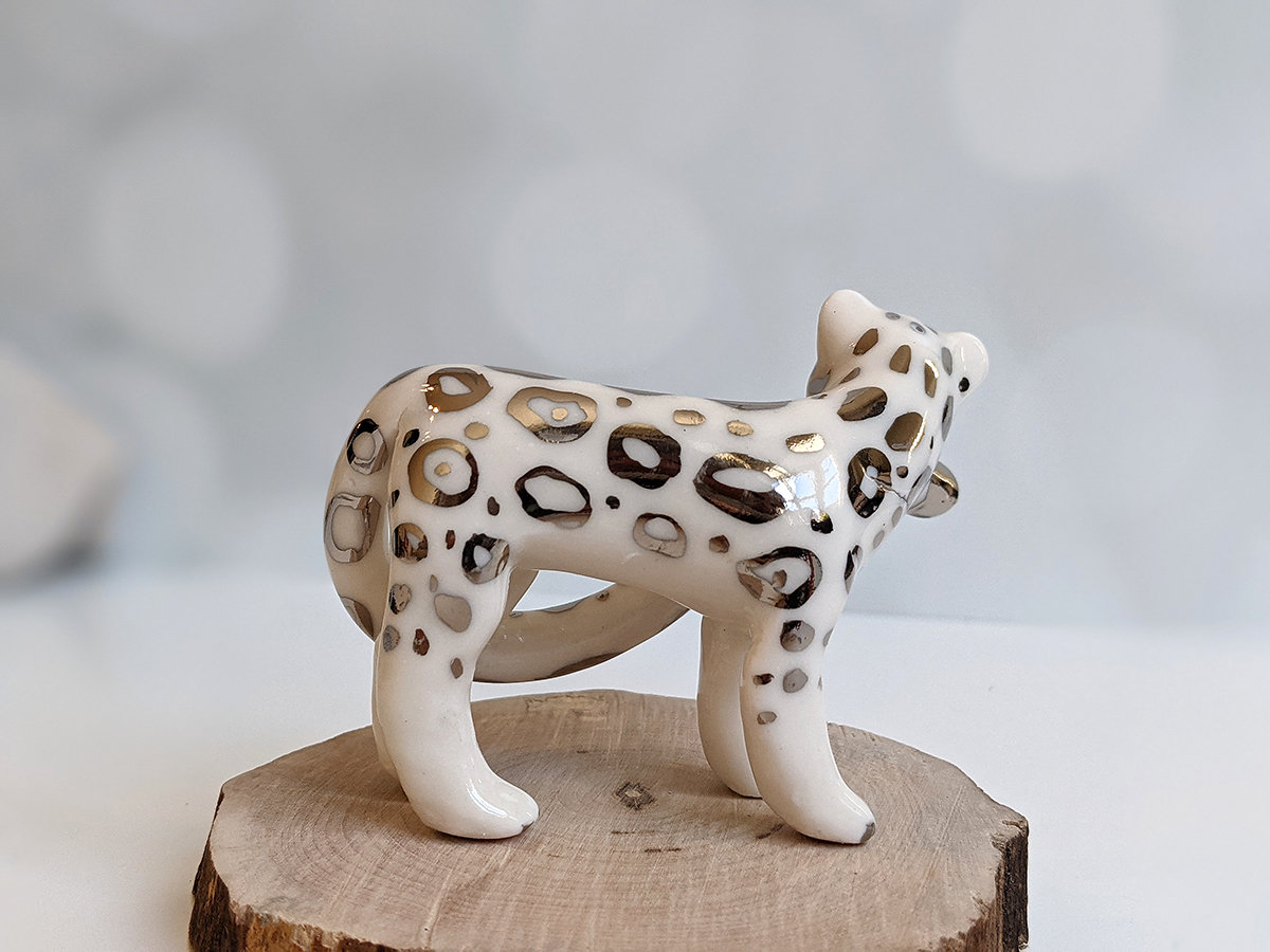 Porcelain Figurine : Snow Leopard + Tail – White Gold