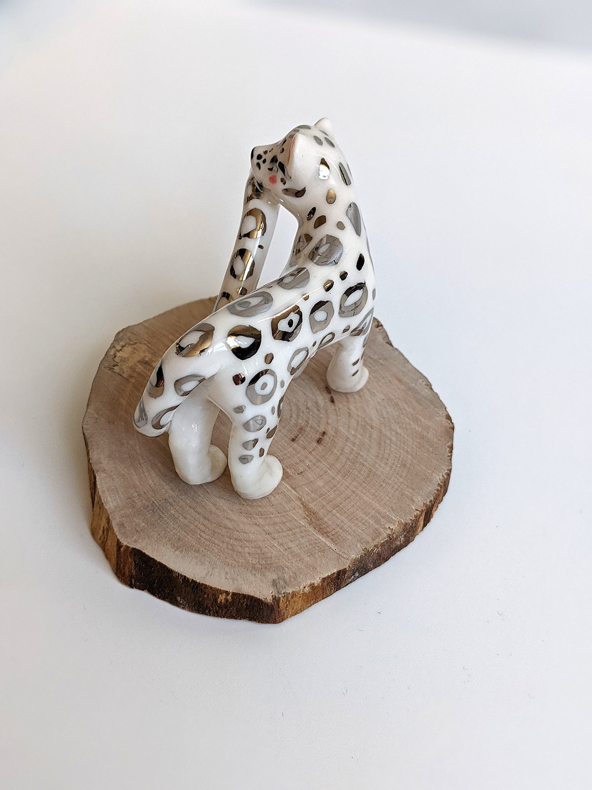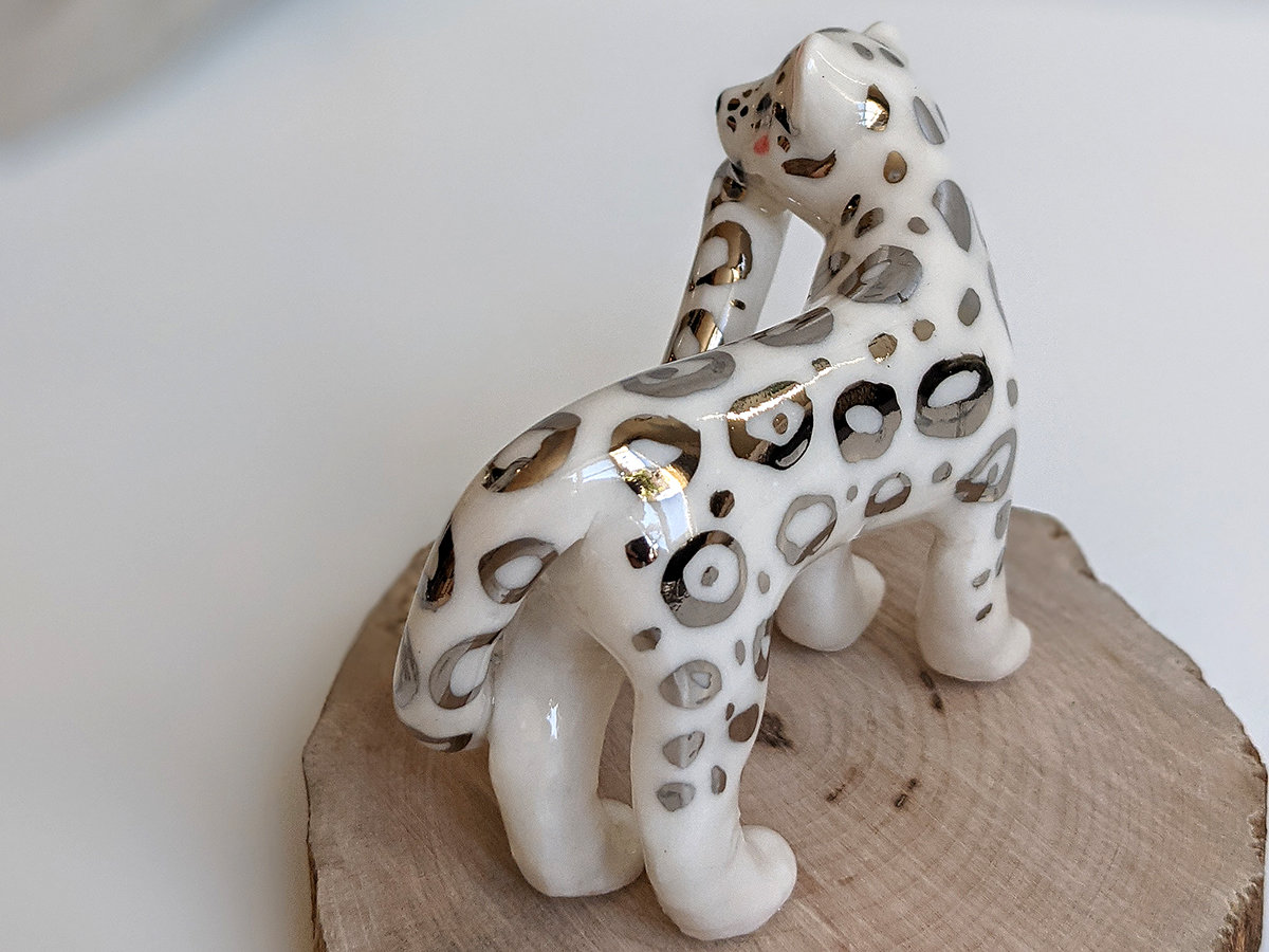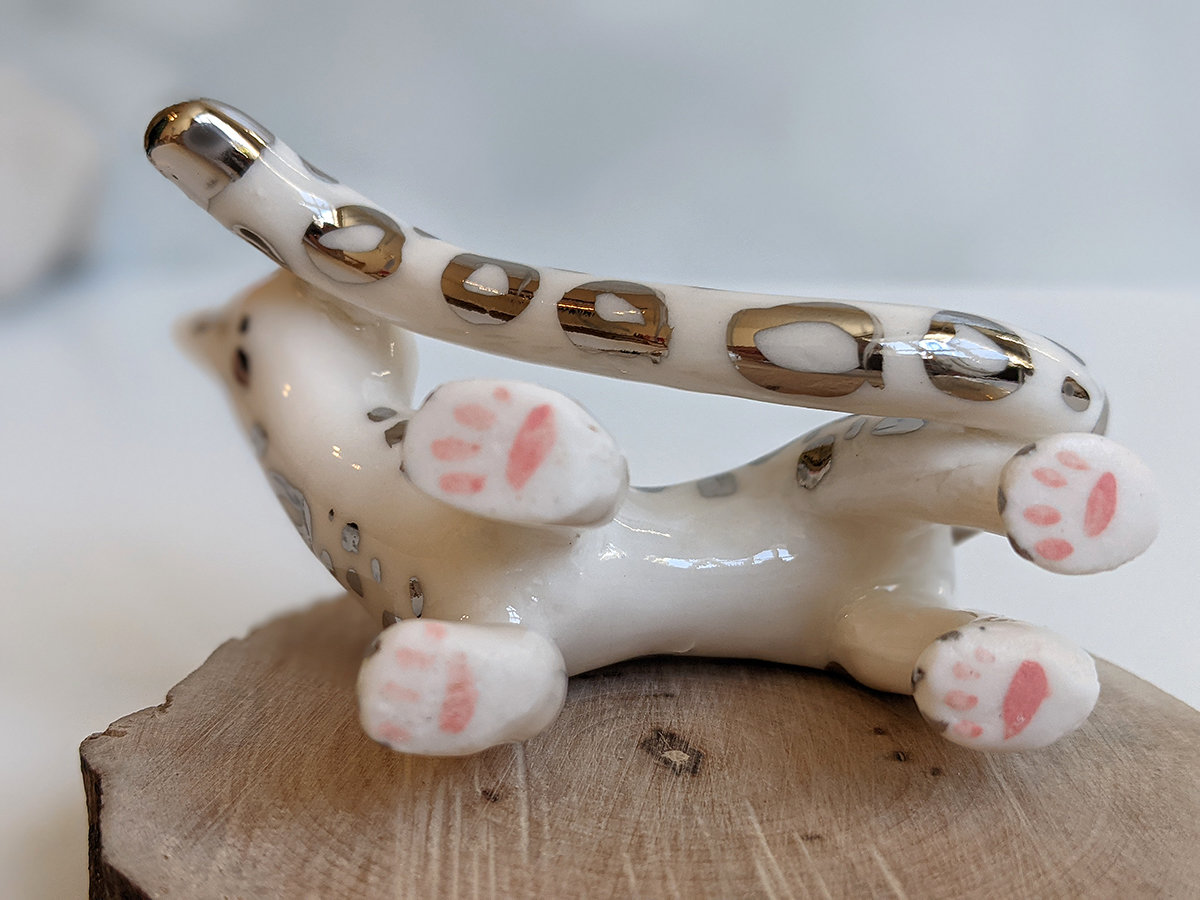 Playful Snow Leopard figurine in porcelain, and white gold spots. I added the toe beans in pink underneath each paw. About 7/8 cm long, one of a kind piece handmade in Québec.