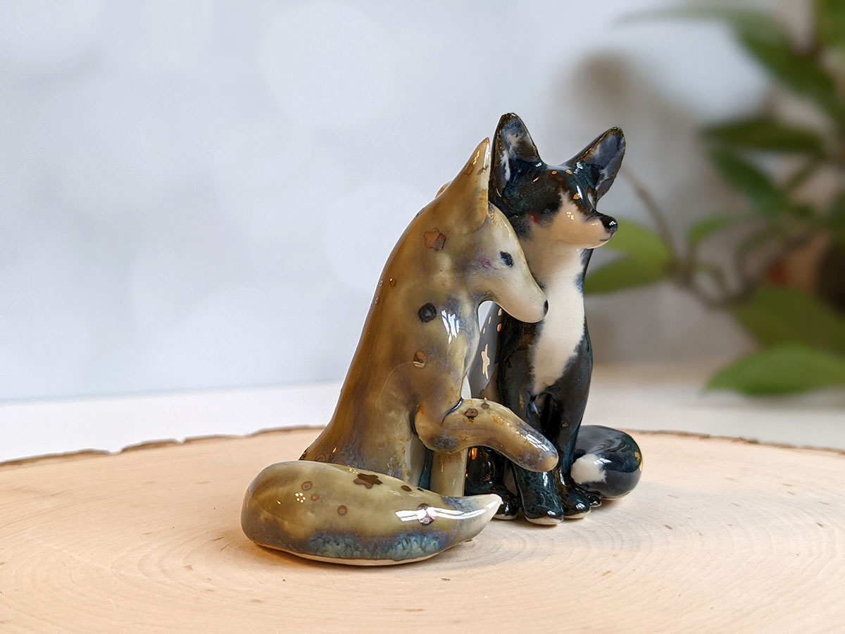 A pair of foxes, both pieces go together and can snuggle in a sweet display. About 8 cm high, these two foxes are handmade and decorated with fine gold, yellow for the dark fox and white gold for the light fox.