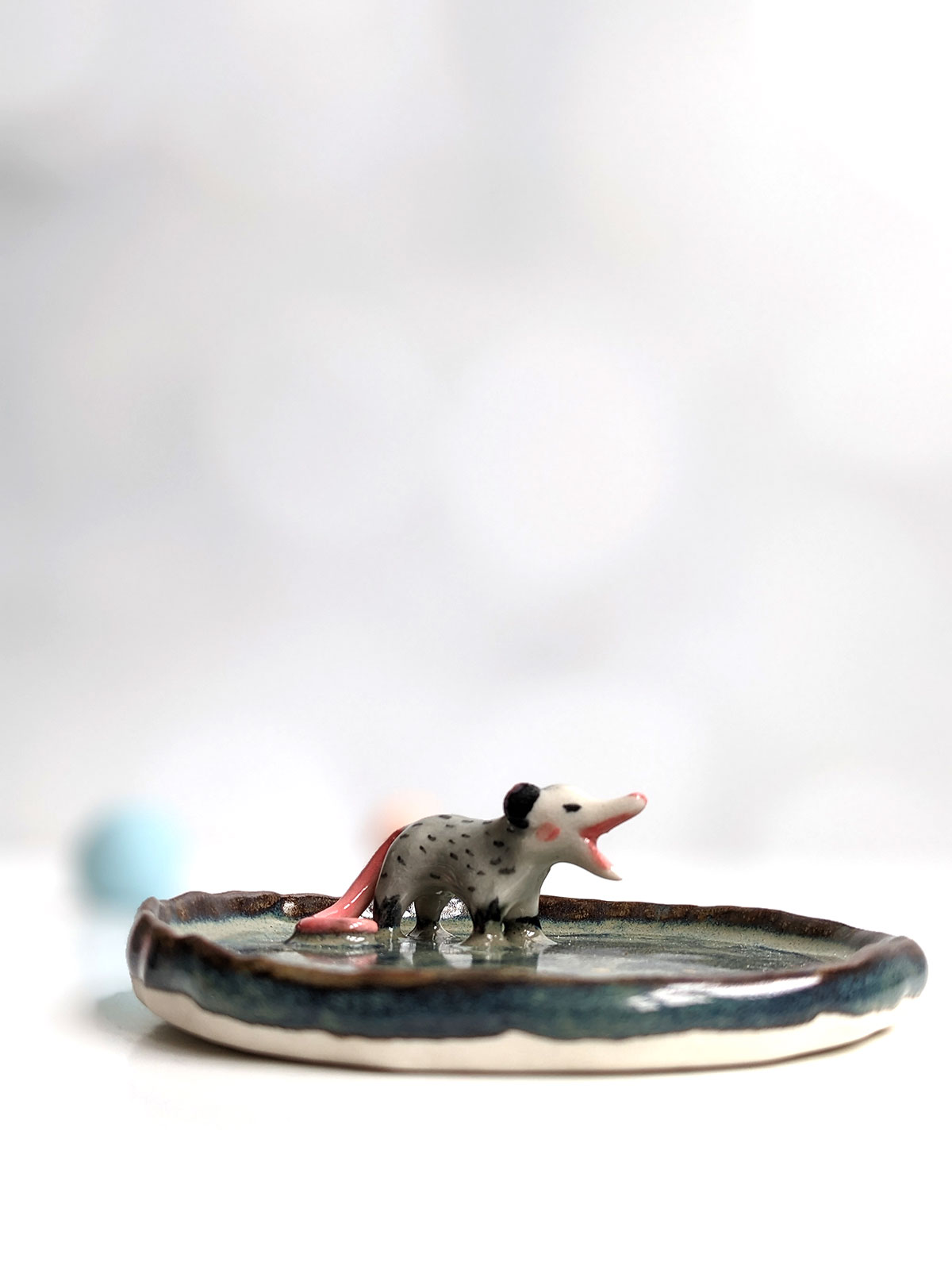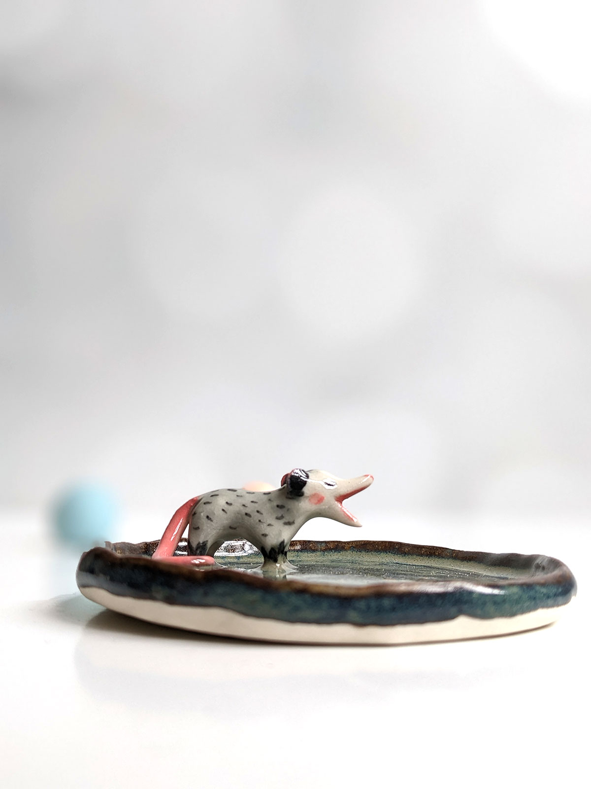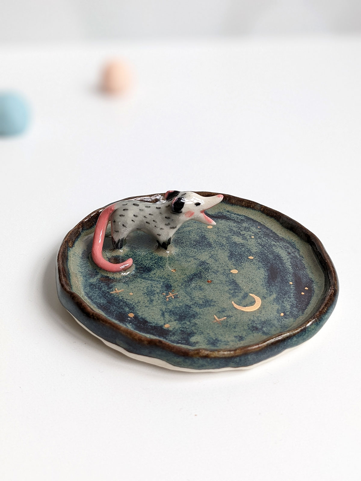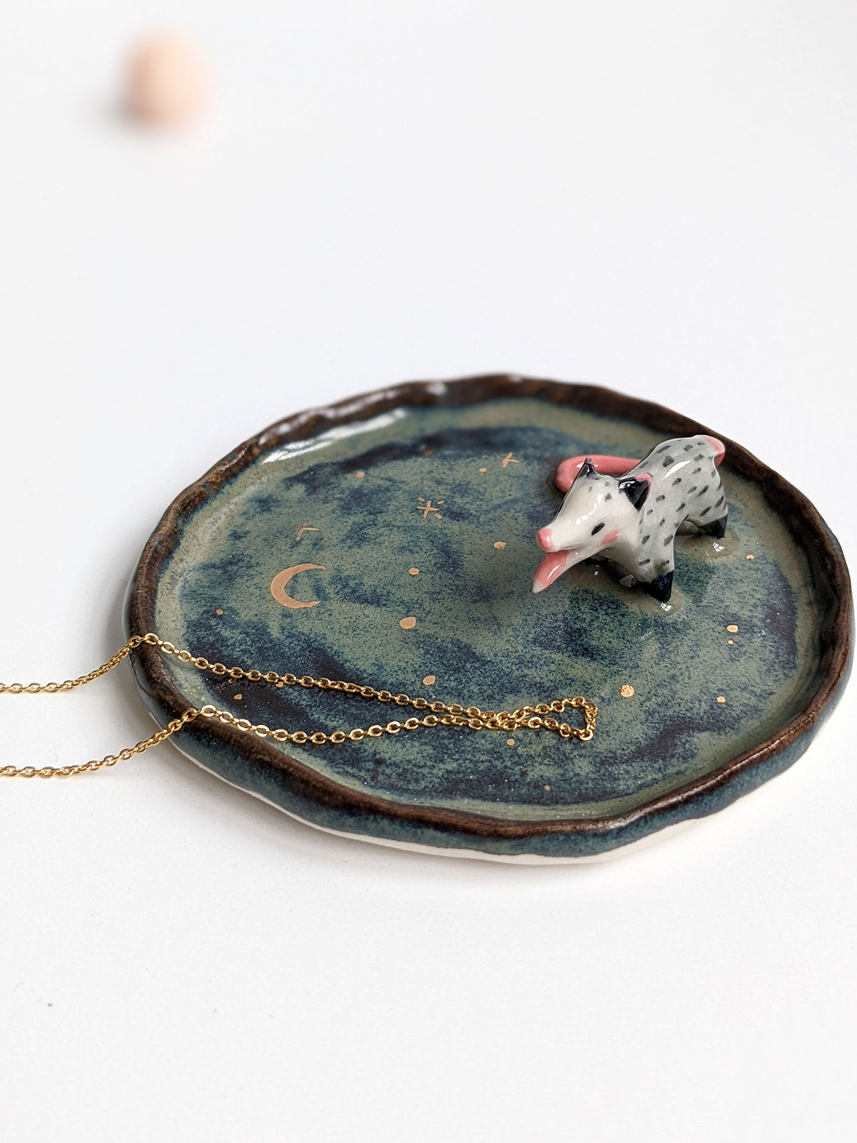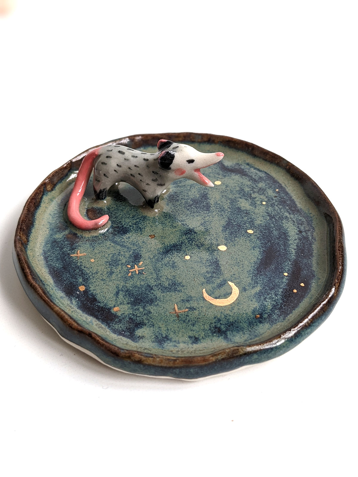 Small jewelry dish, in porcelain, storm cloud glaze and a small screaming opossum, highlights of yellow gold stars. This piece is handcrafted in Montréal. About 7-8 cm wide.