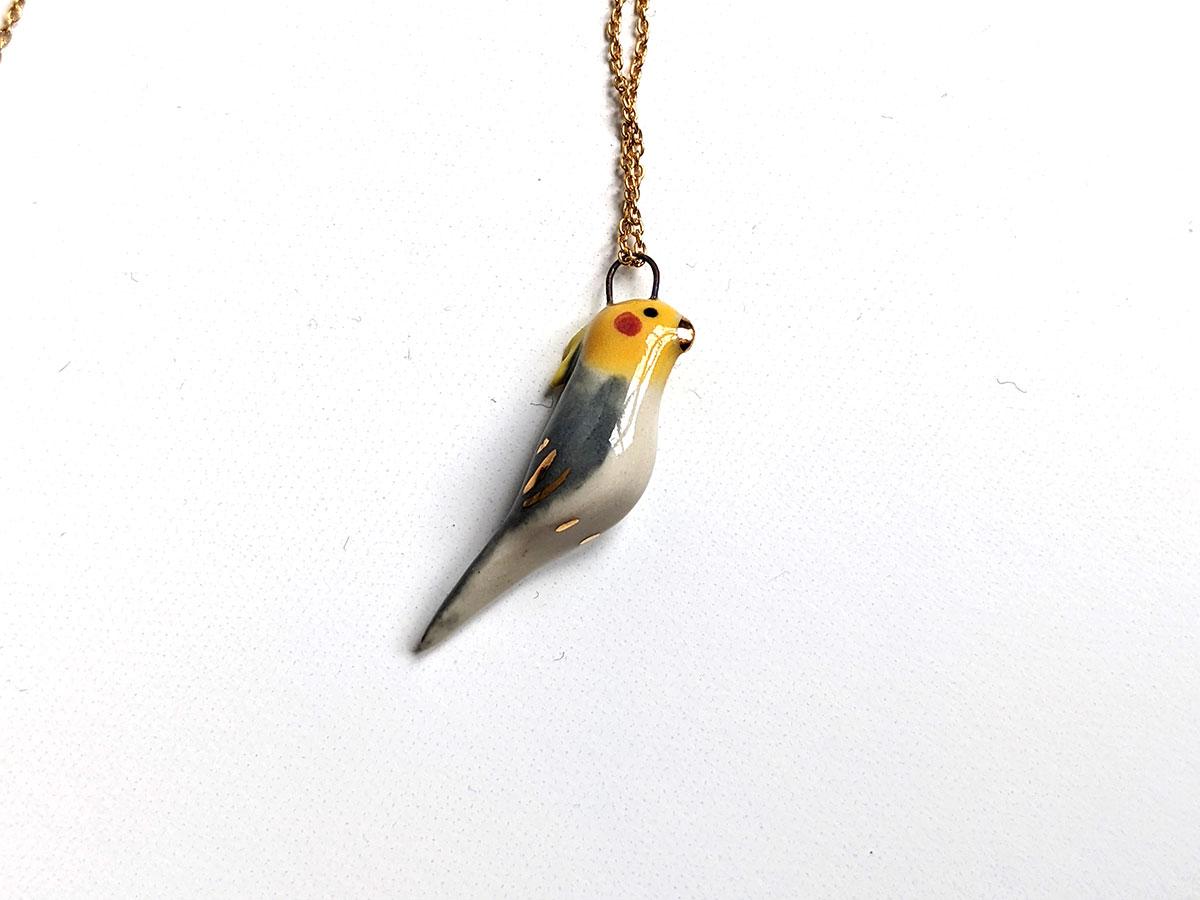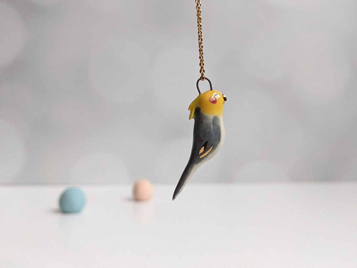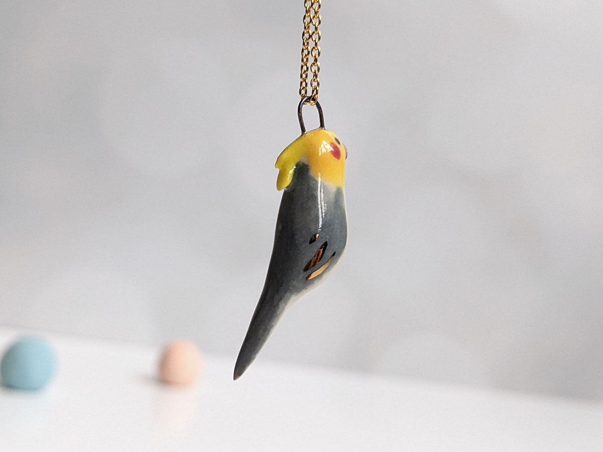 Tiny cockatiel pendant, grey, yellow and white with red cheeks gold highlights. This handmade pendant is the perfect gift for the bird lover.