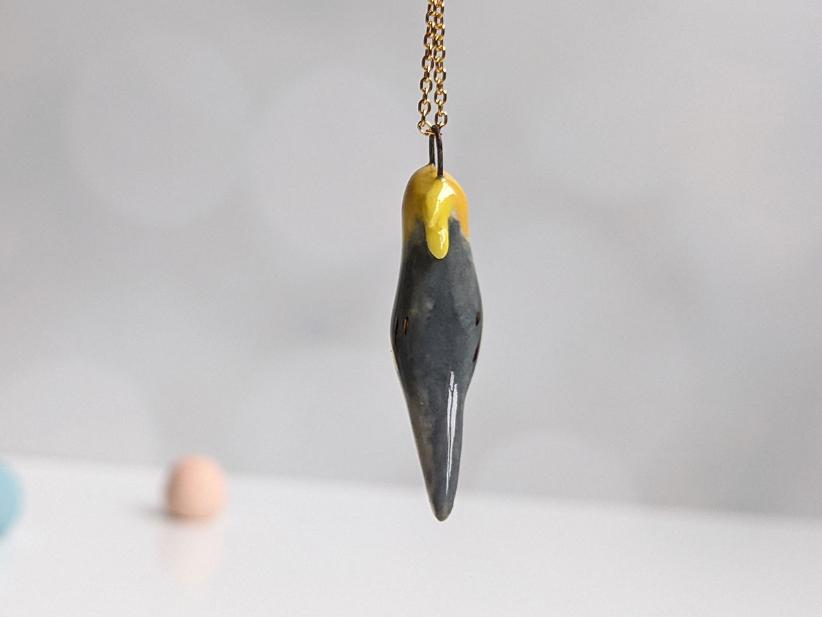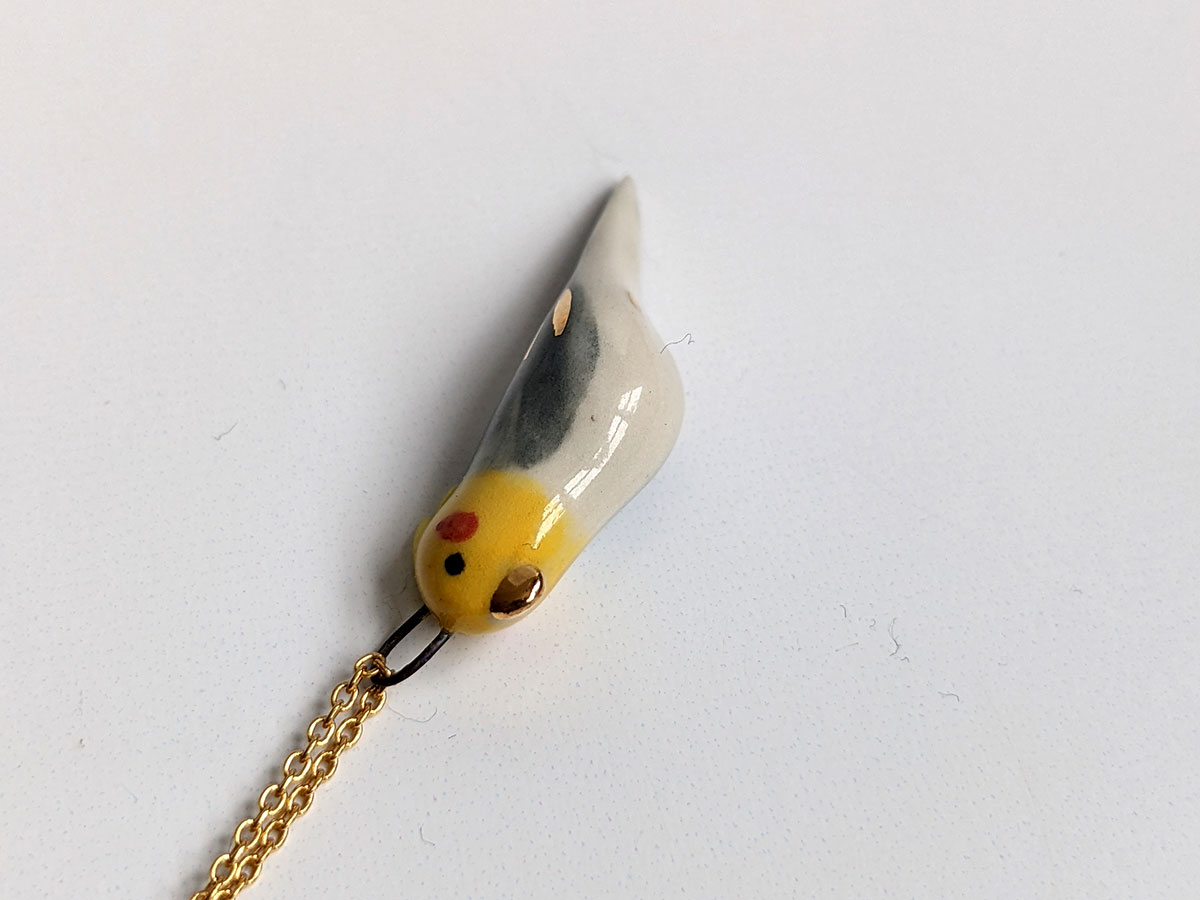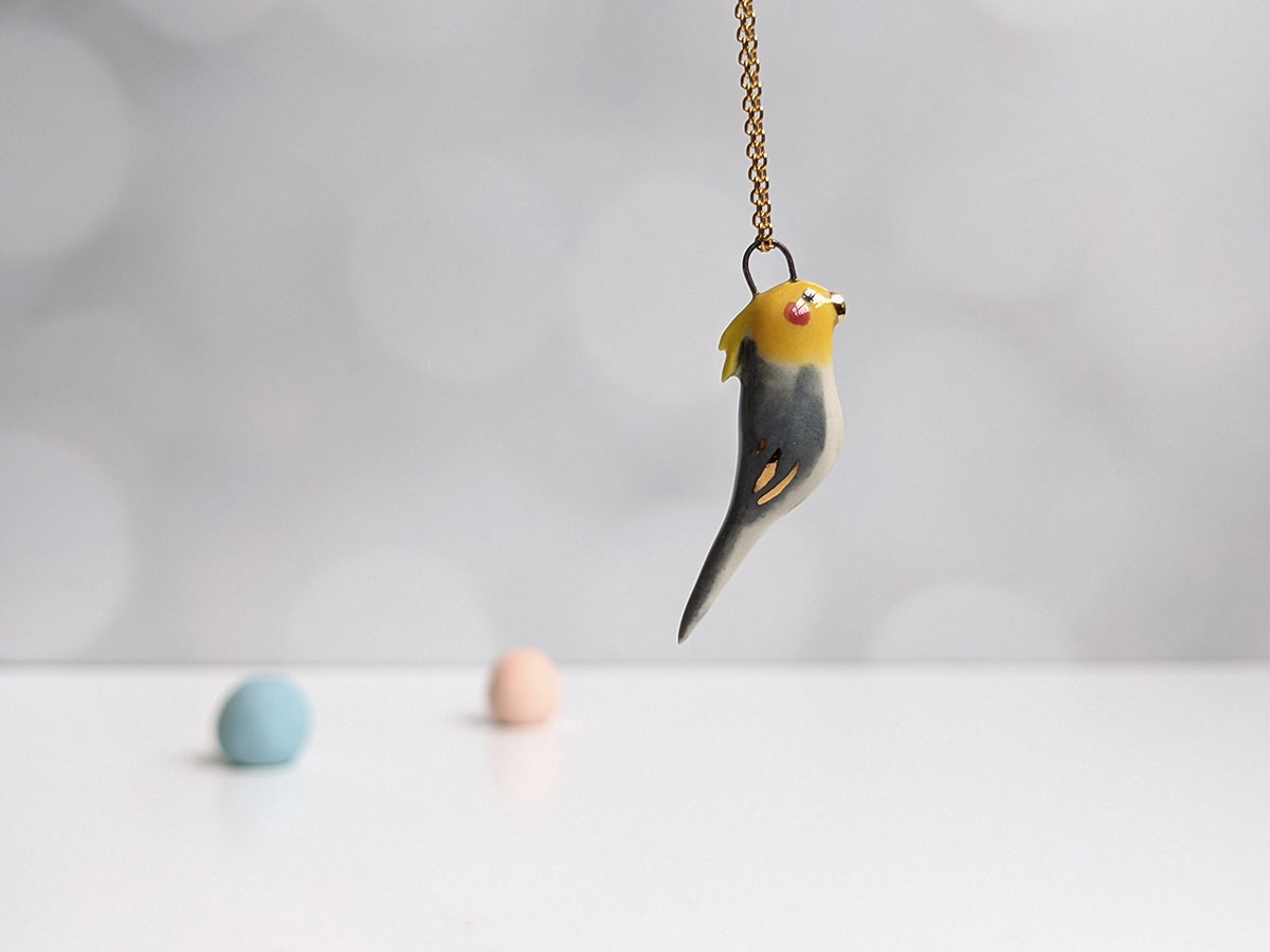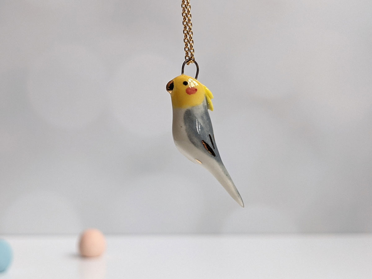 Tiny cockatiel pendant, grey, yellow and white with red cheeks gold highlights. This handmade pendant is the perfect gift for the bird lover.