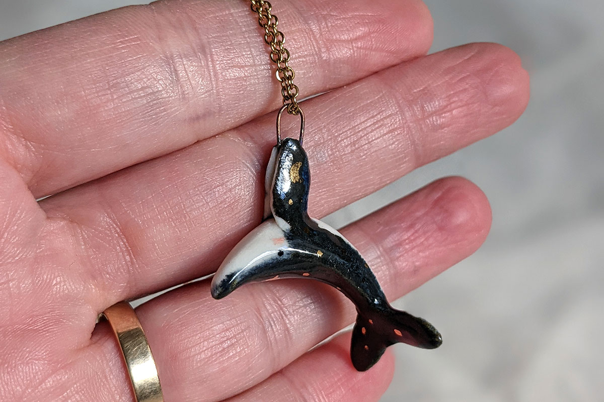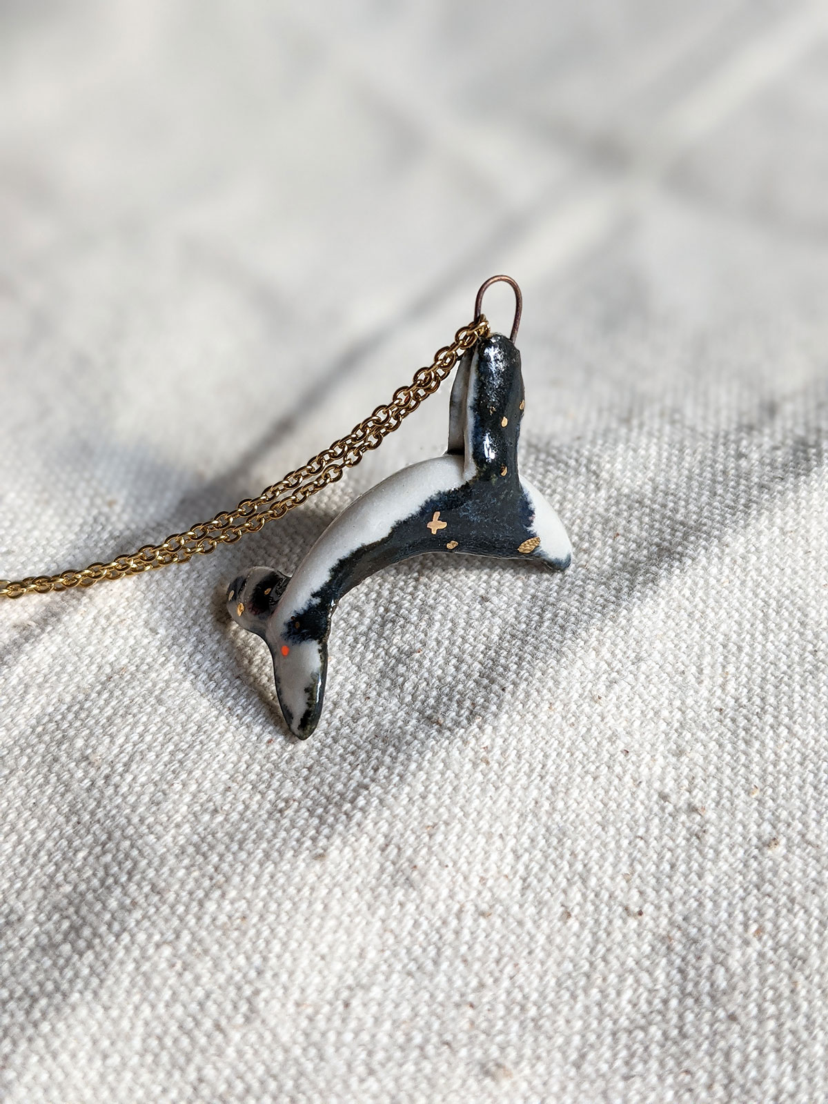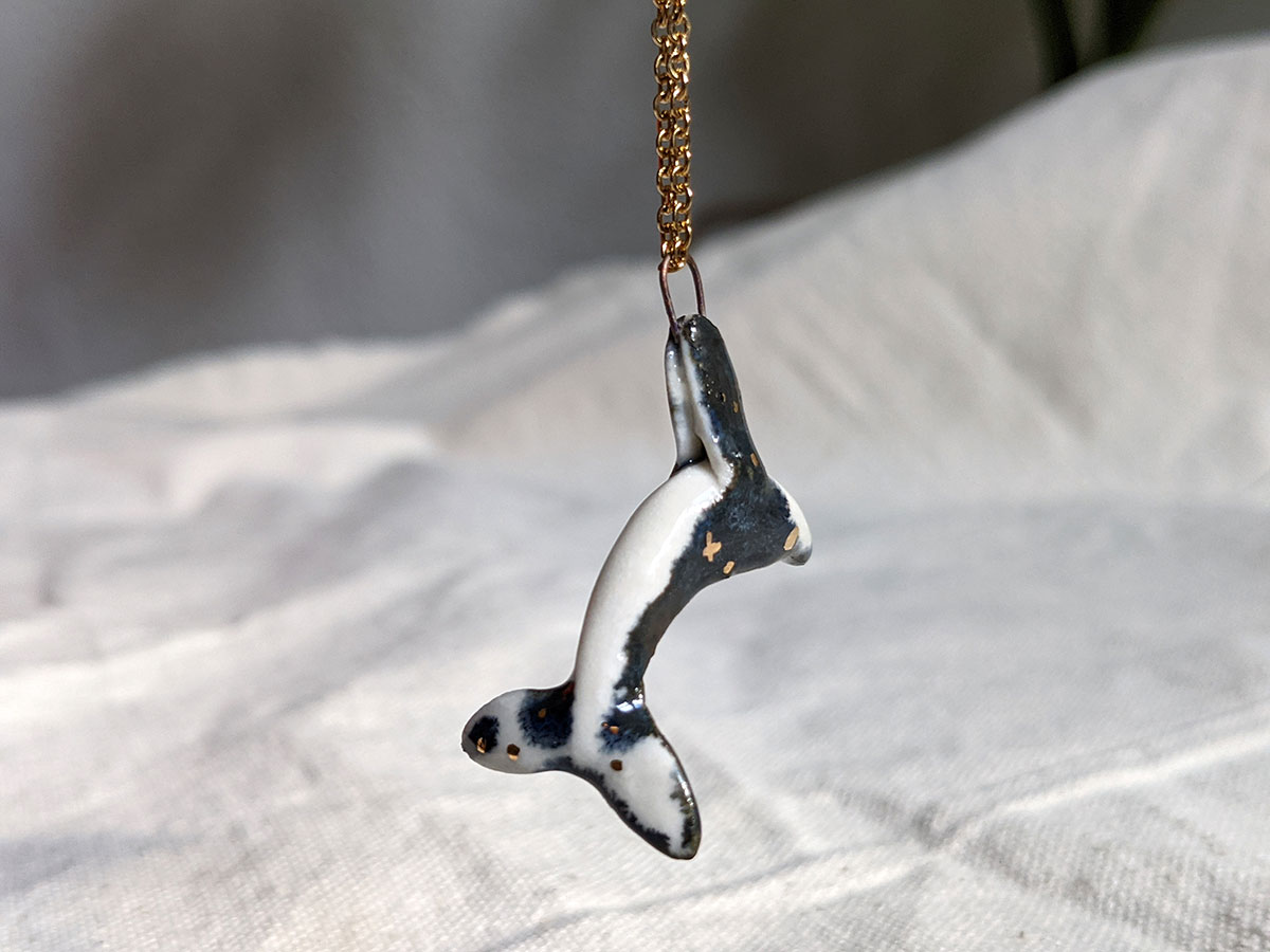 Handsculpted porcelain pendant of a humpback whale, decorated in a night sky glaze with yellow gold stars. One of a kind piece of ceramics jewelry, handcrafted in Montréal, Québec. This little whale is about 2 cm long. Chain sold separately.