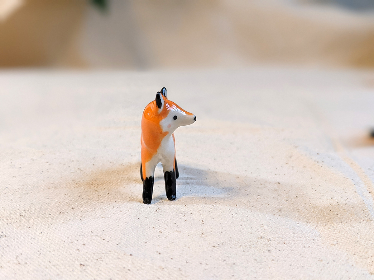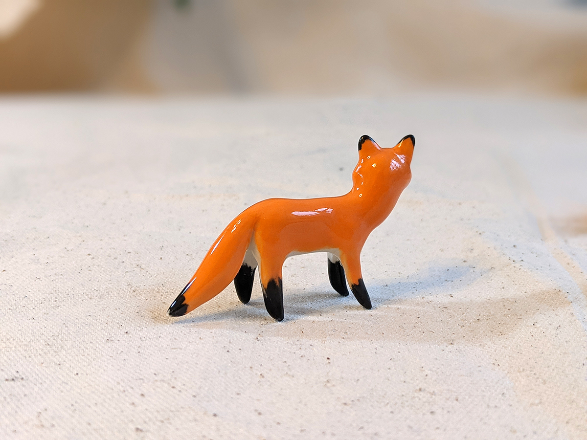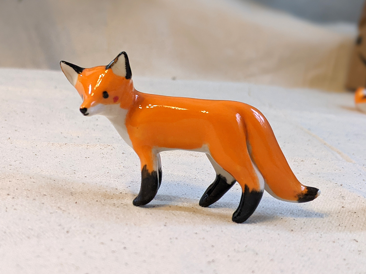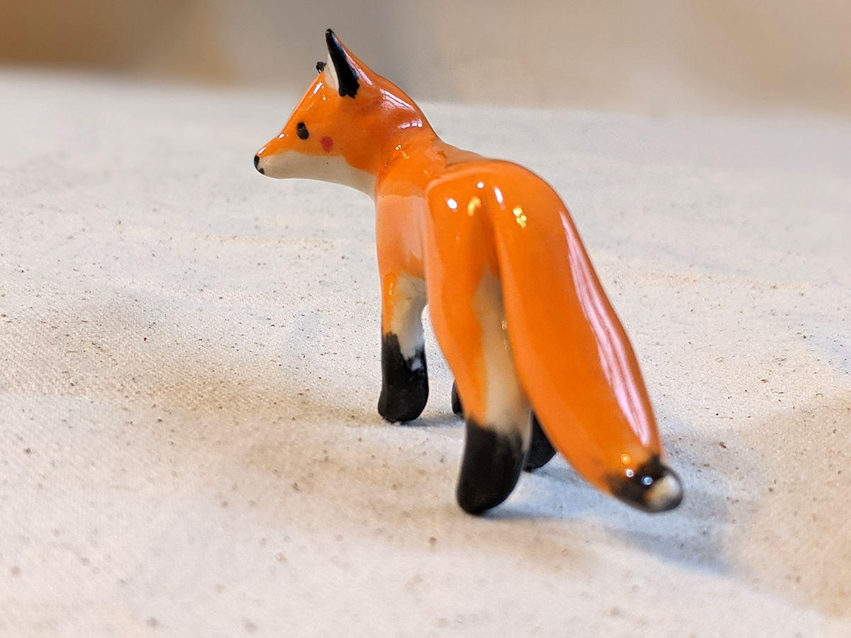 Cute red fox, handcrafted in porcelain. About 8 cm long.