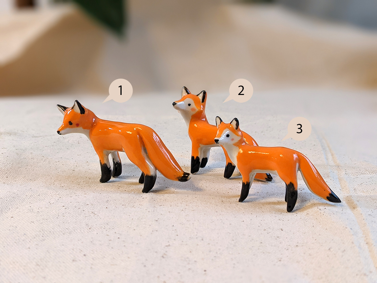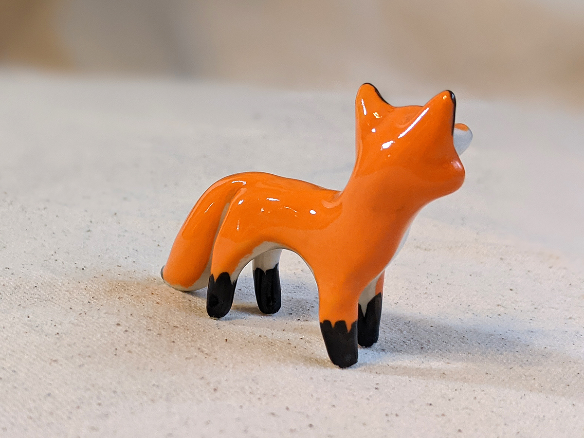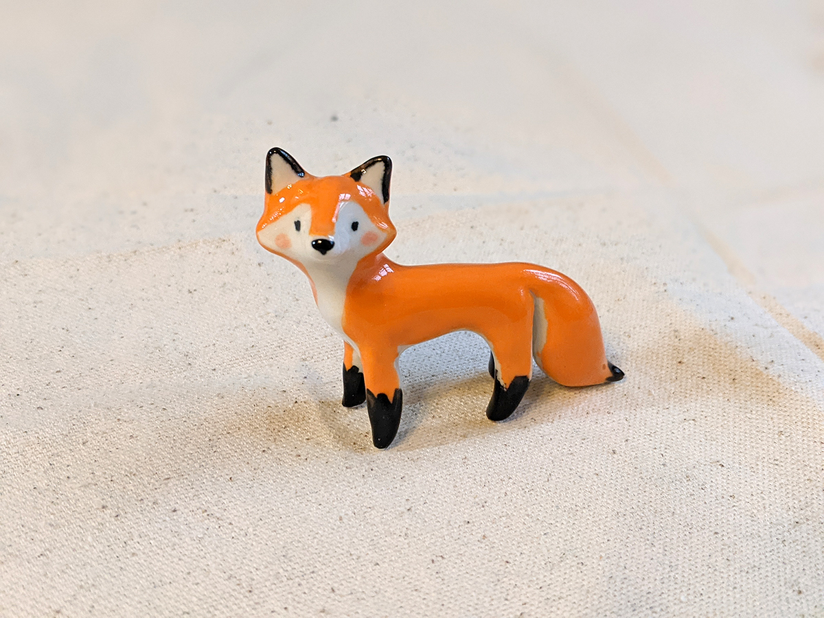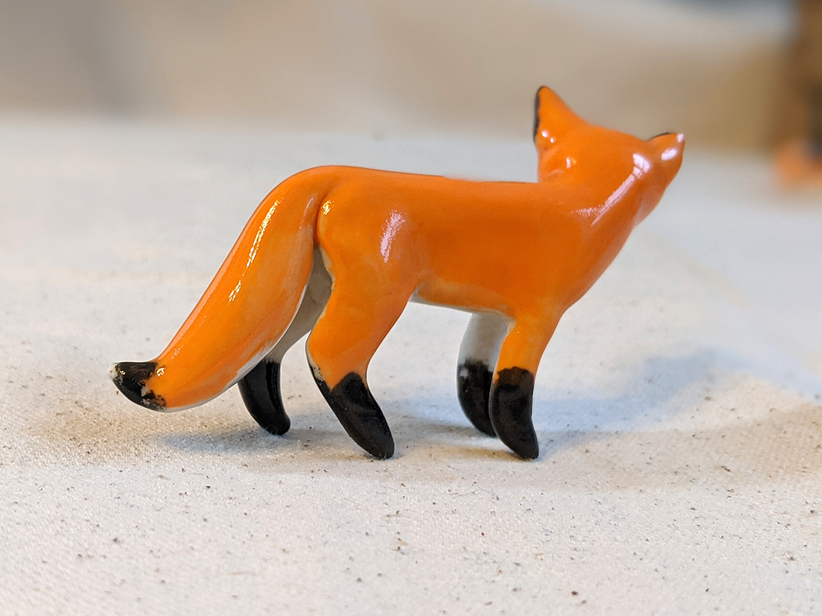 Cute red fox, handcrafted in porcelain. About 8 cm long.