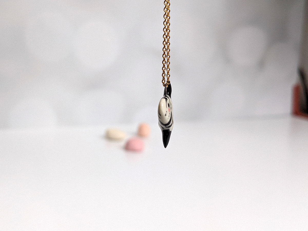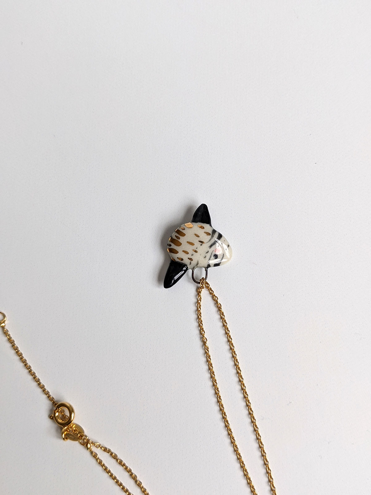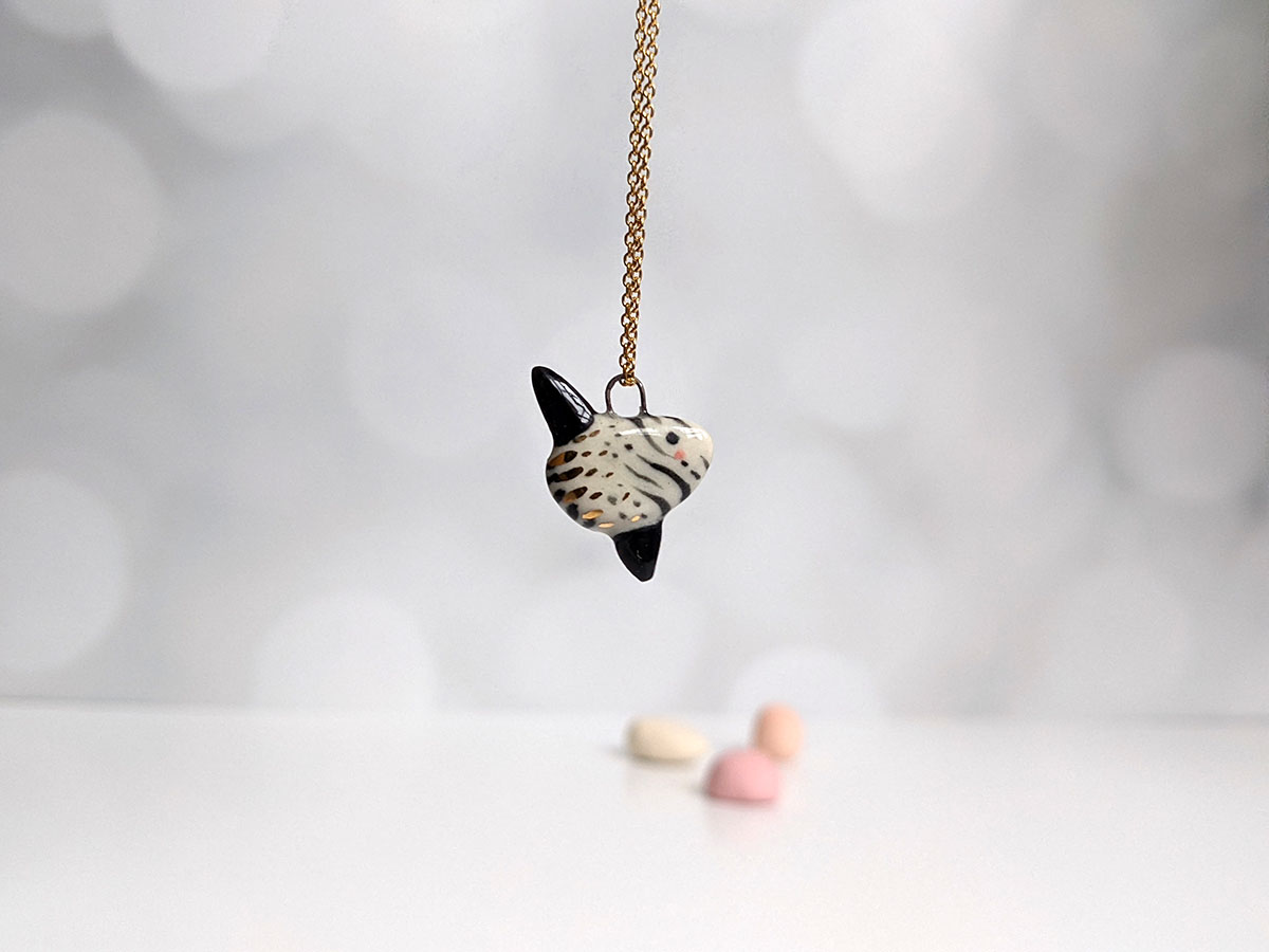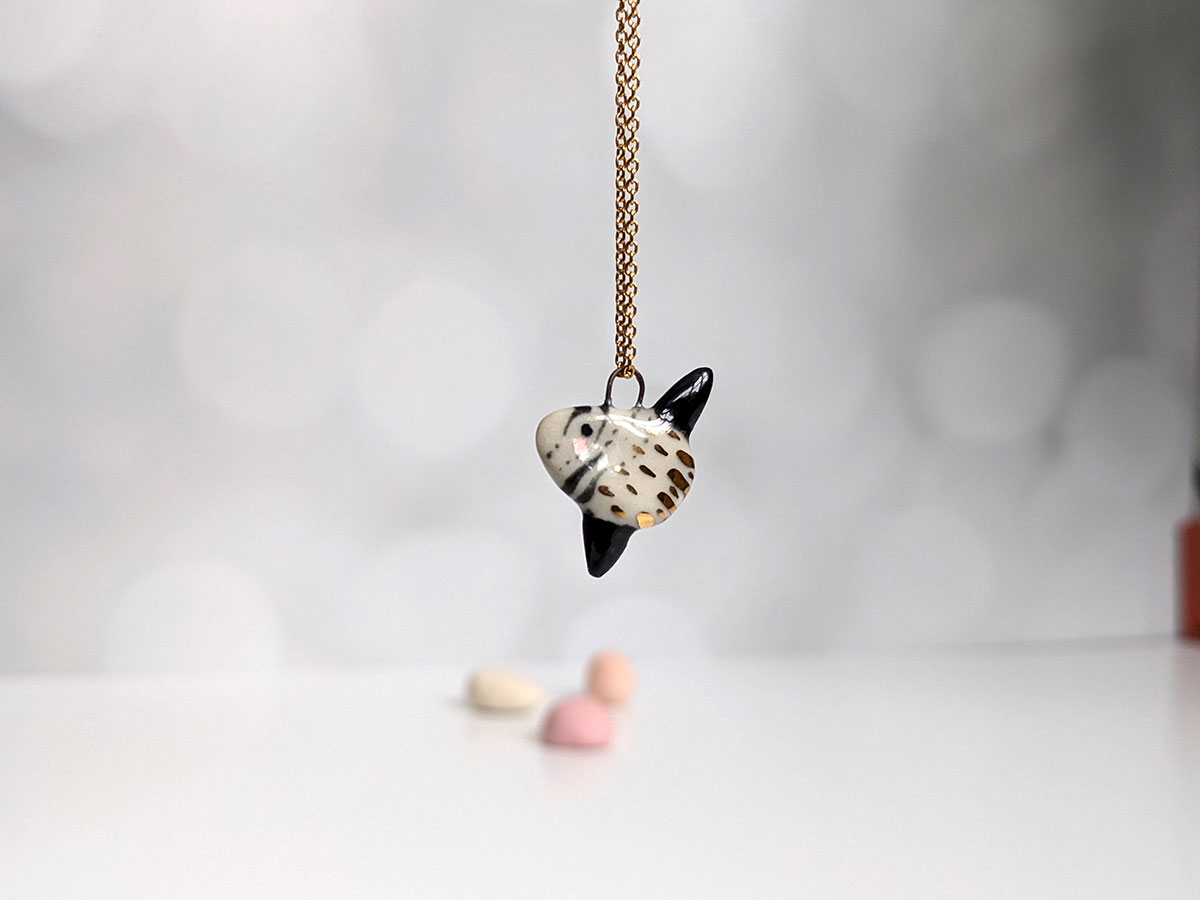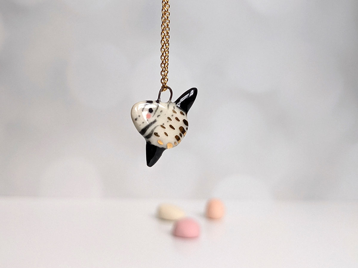 Super cute slender sunfish pendant, white porcelain with black markings and gold highlights. One of a kind Ranzaniaa, about 2 cm high. Chain not included.