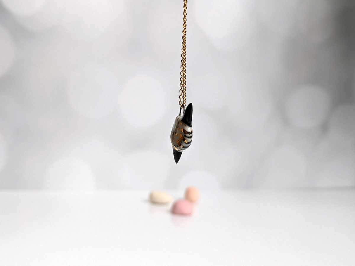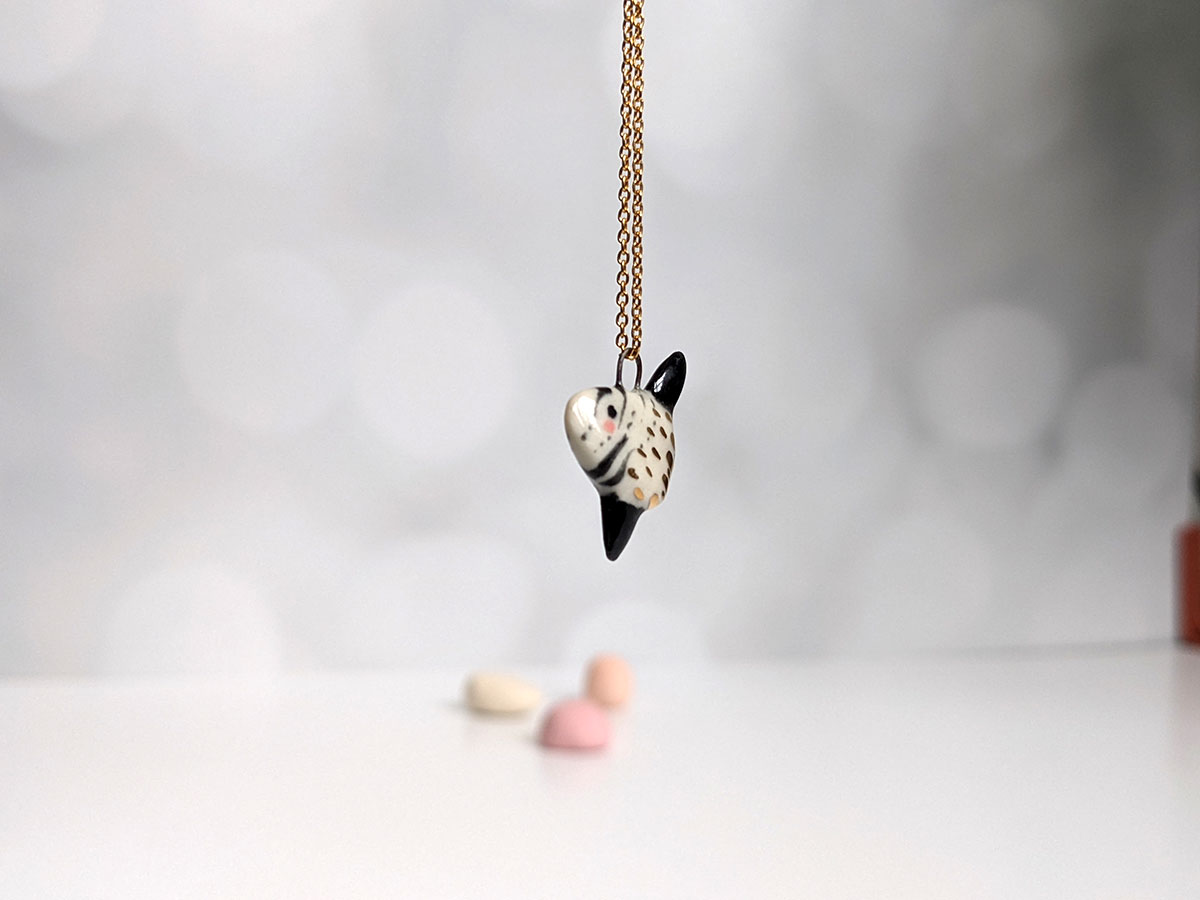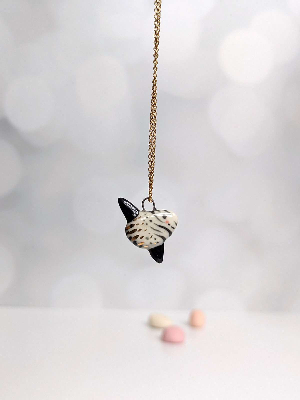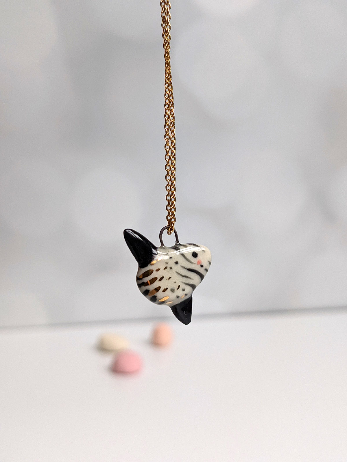 Super cute slender sunfish pendant, white porcelain with black markings and gold highlights. One of a kind Ranzaniaa, about 2 cm high. Chain not included.