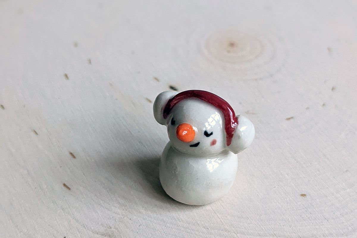 Small porcelain snowman figurine, about 4-5 cm high. Handcrafted in Montréal.