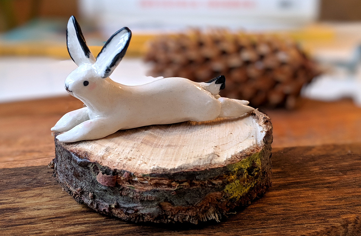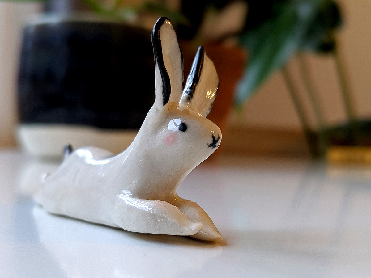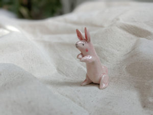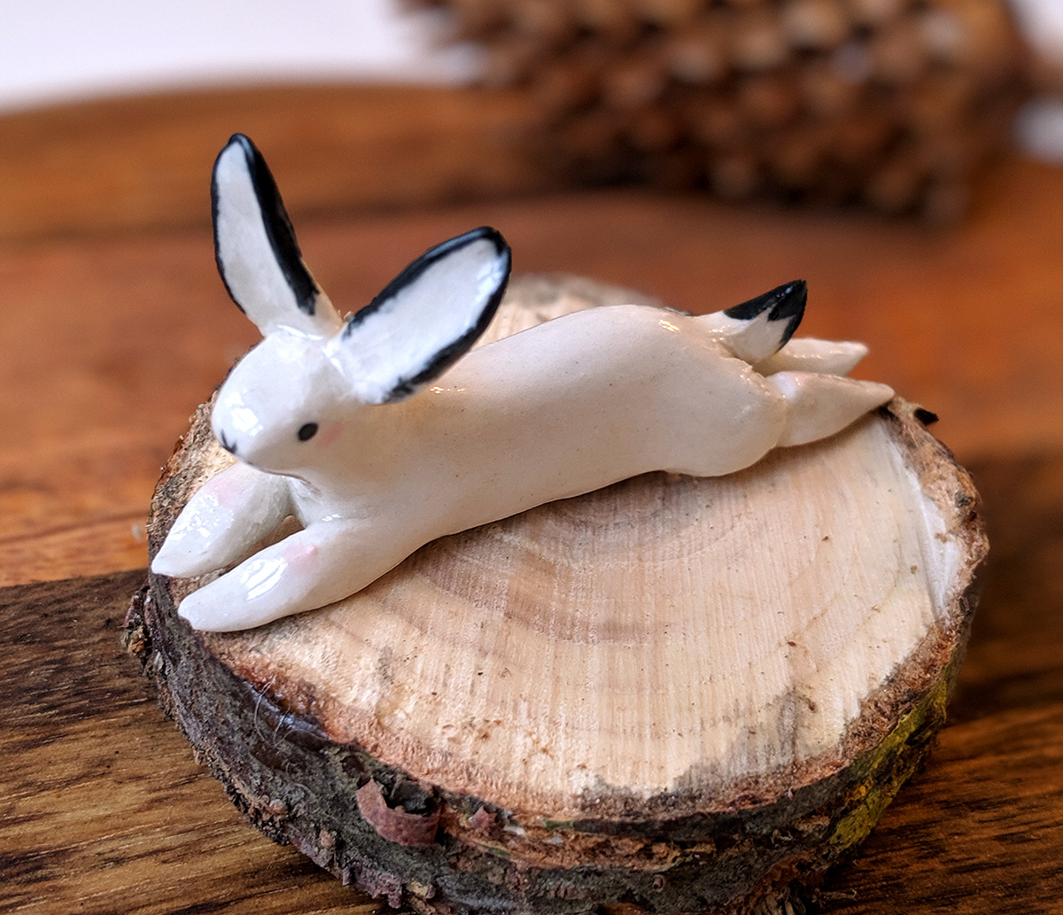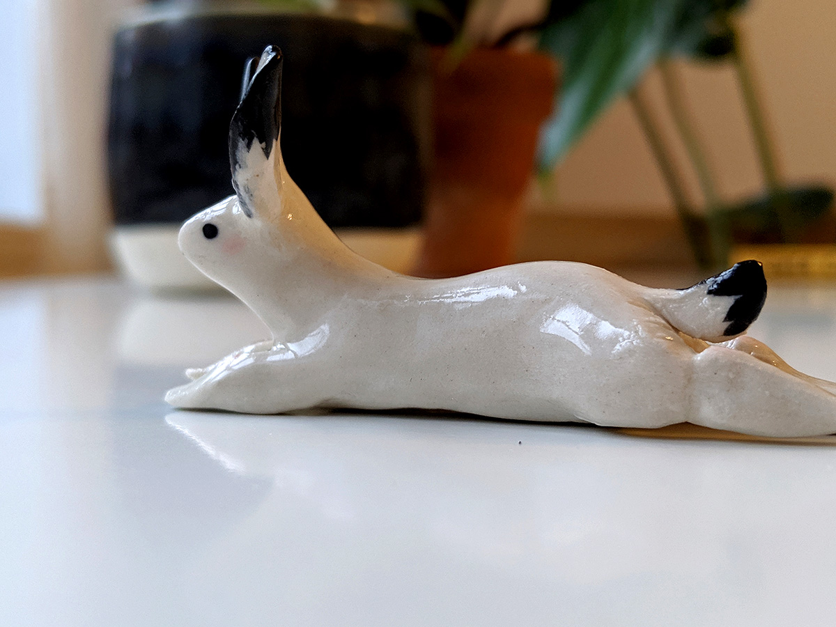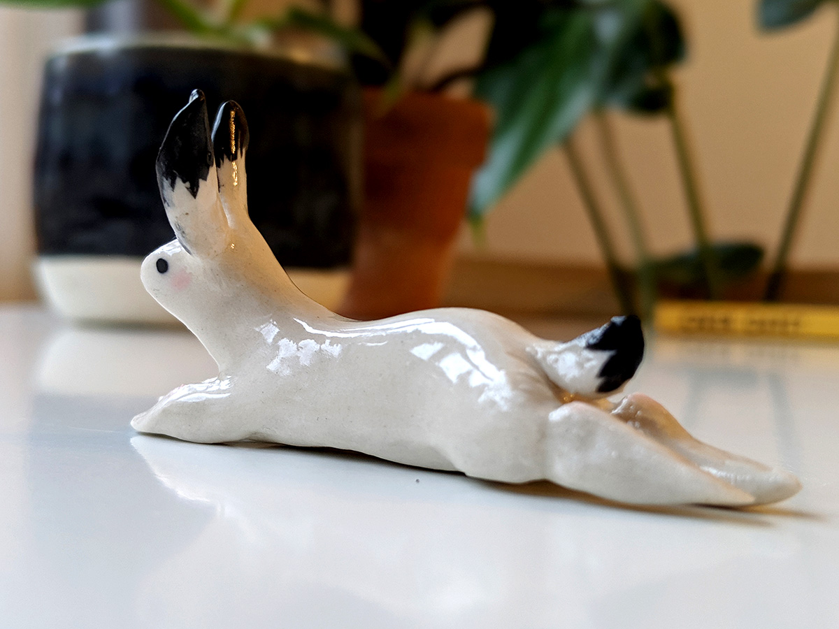 Splooted ceramic bunny, about 9 cm long. Unique piece in white porcelain with pink cheeks and black details.