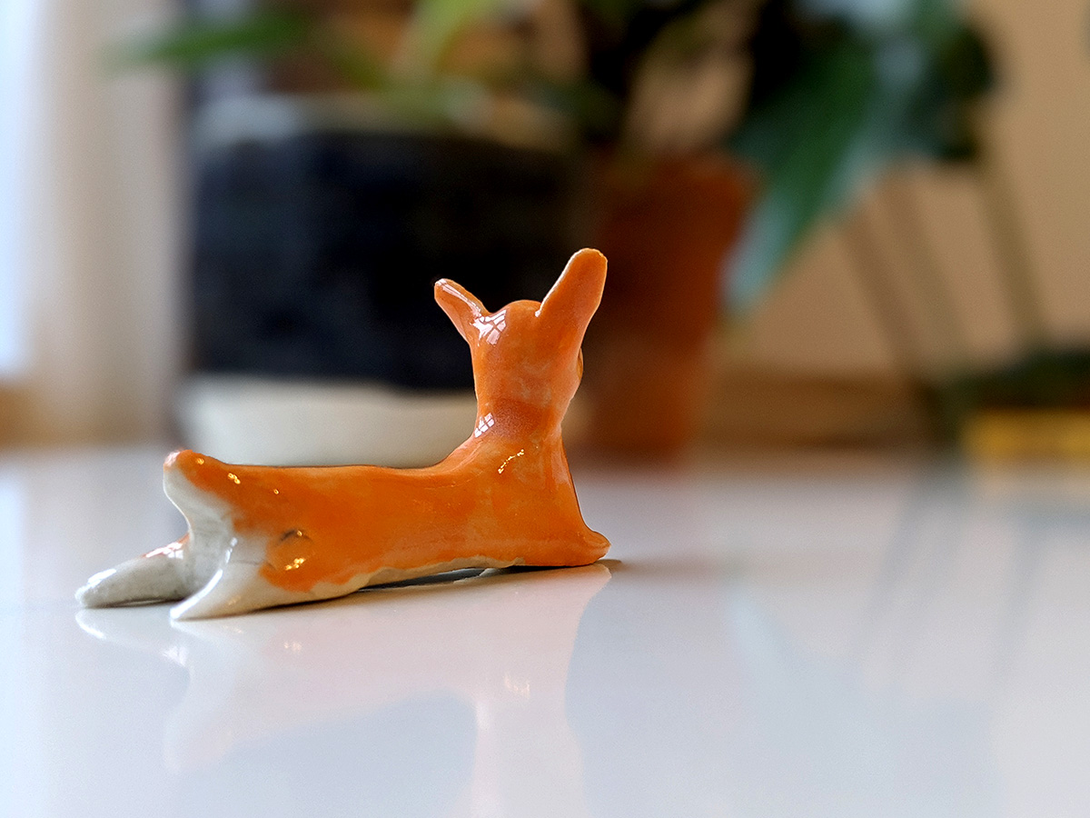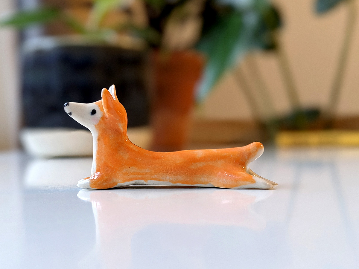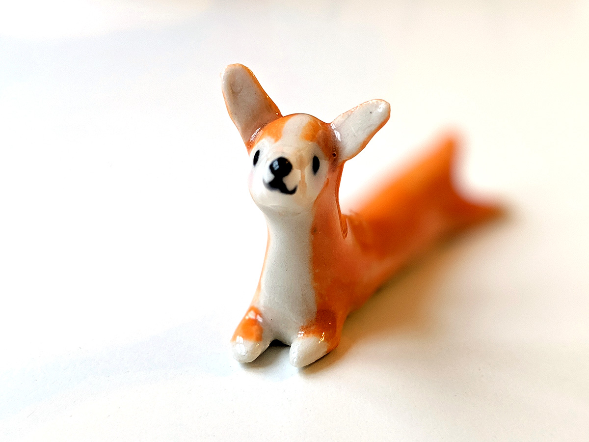 Splooted welsh corgi is a unique piece, handmade with clay and glaze. About 8cm wide and 3cm high.