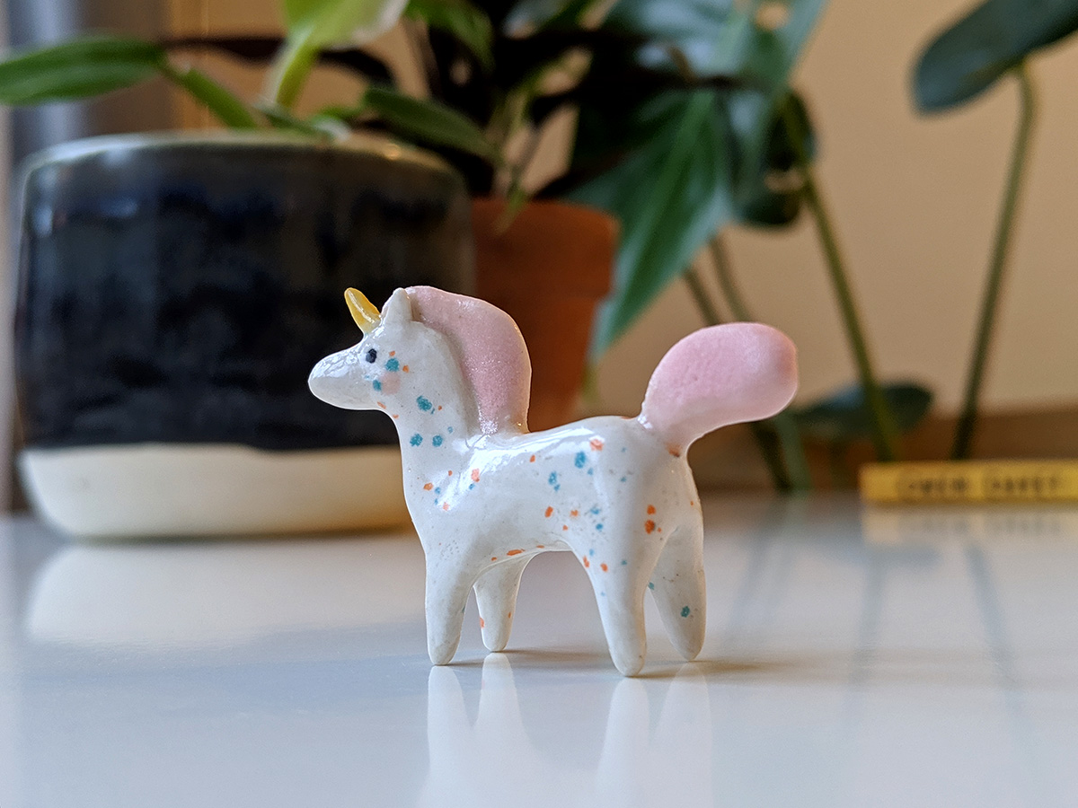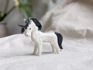 Small sprinkled ceramic unicorn. Miniature lucky figurine handsculpted with love, it will bring you joy as it sits on your desk or keeps company to your best plant friends. About 7 cm in height and length.
