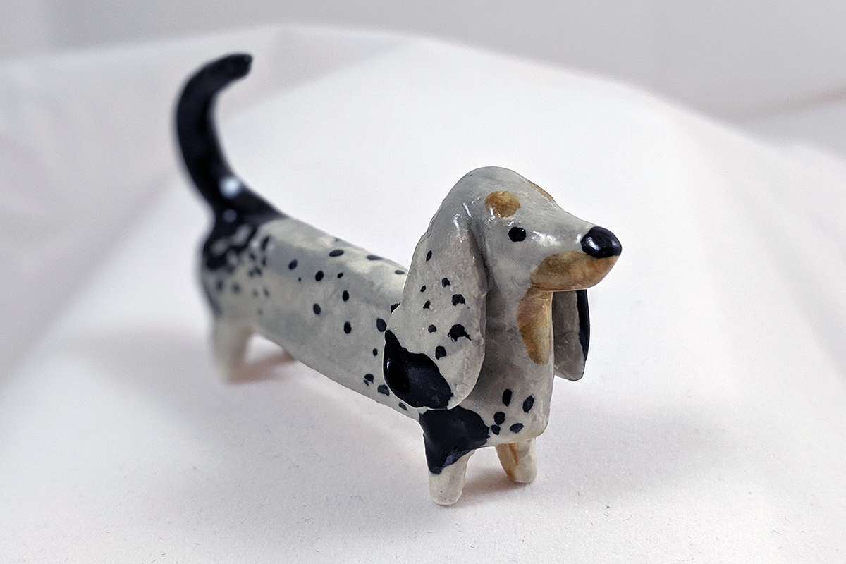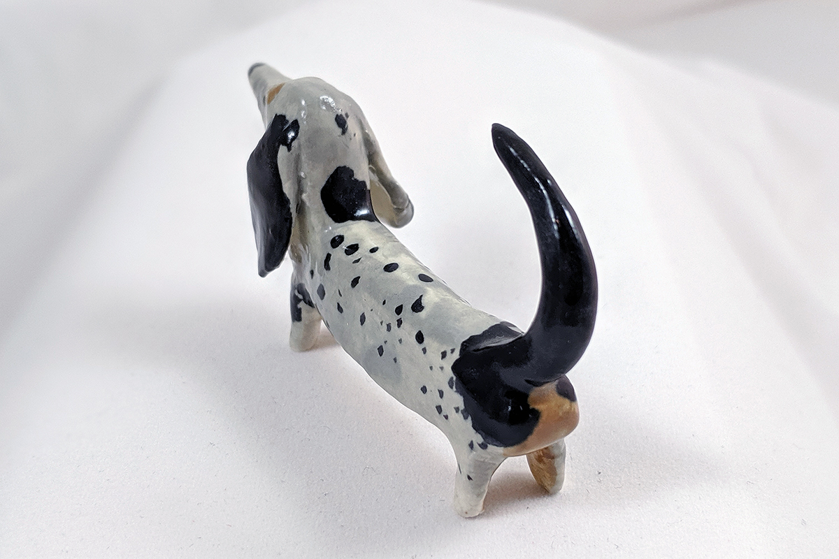 Petit chien saucisse en céramique, robe merle. Particulièrement utile pour les artistes qui souhaitent poser leur pinceau. Environ 6/7 cm de long.