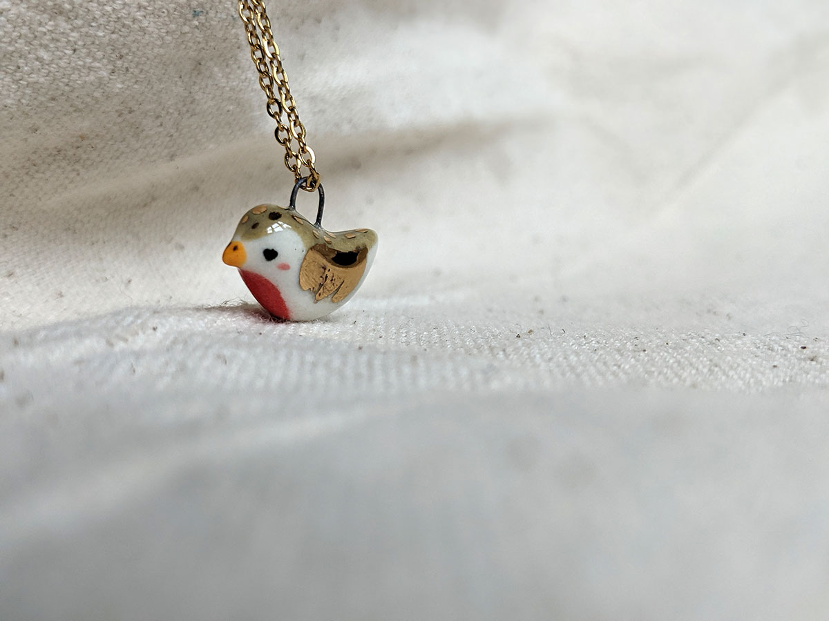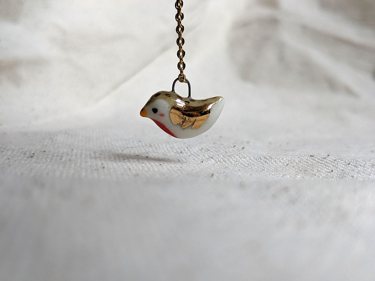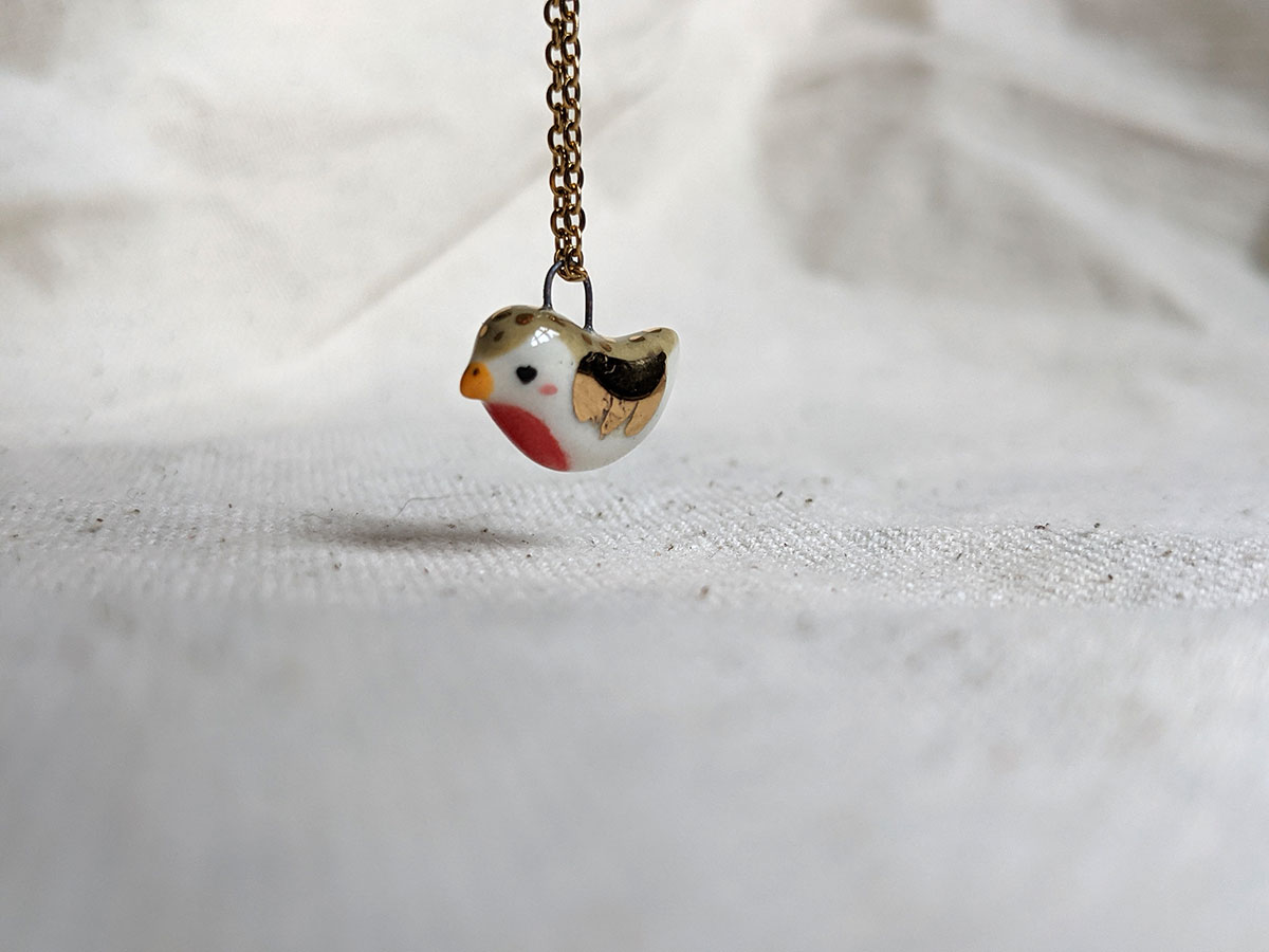 Tiniest porcelain pendant, a bird with gold highlights. One of a kind.