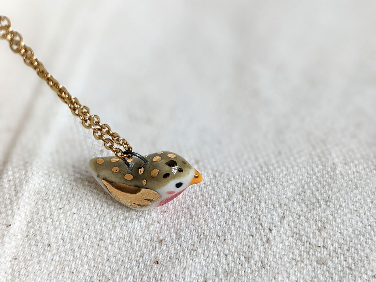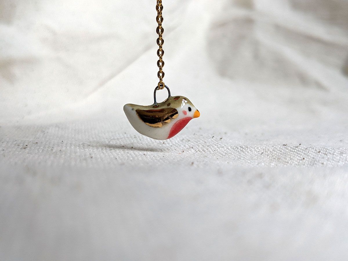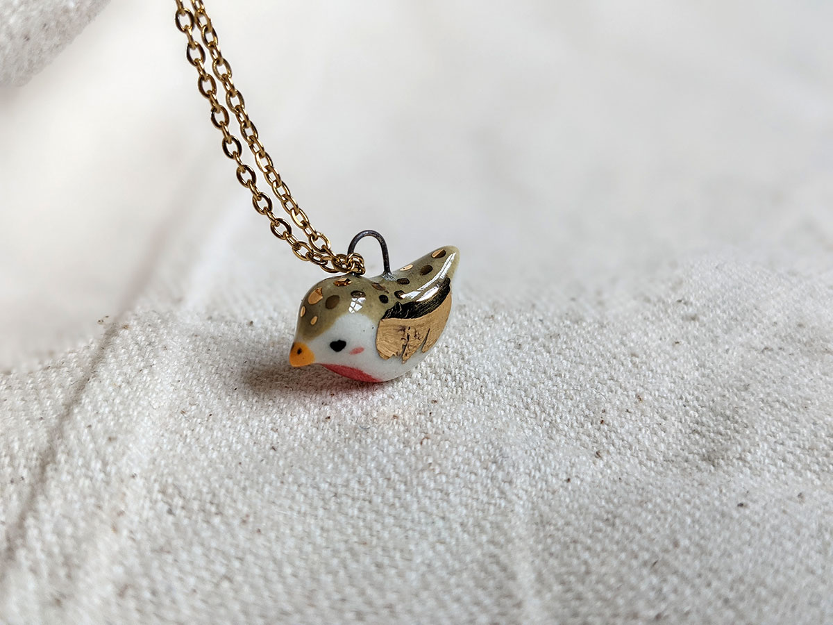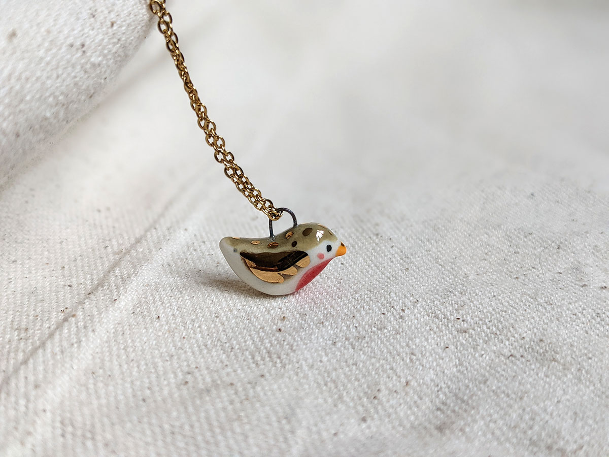 Tiniest porcelain pendant, a bird with gold highlights. One of a kind.