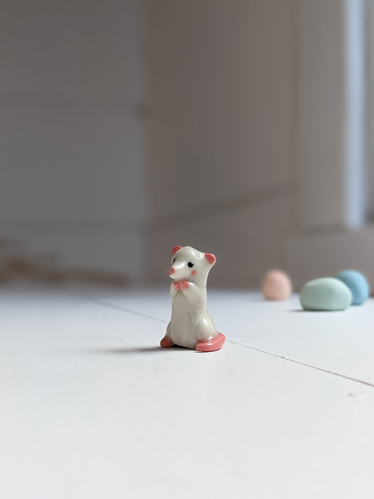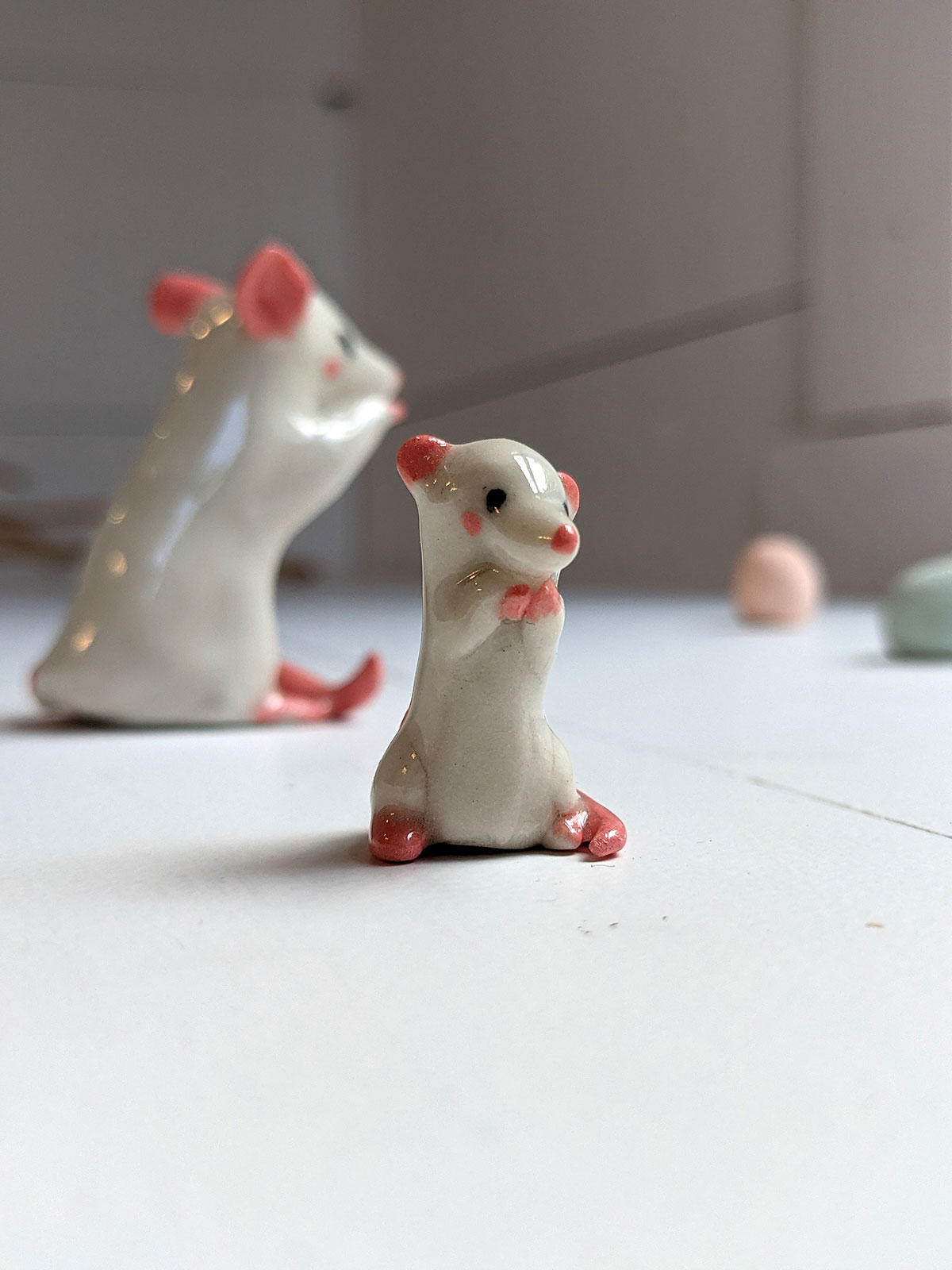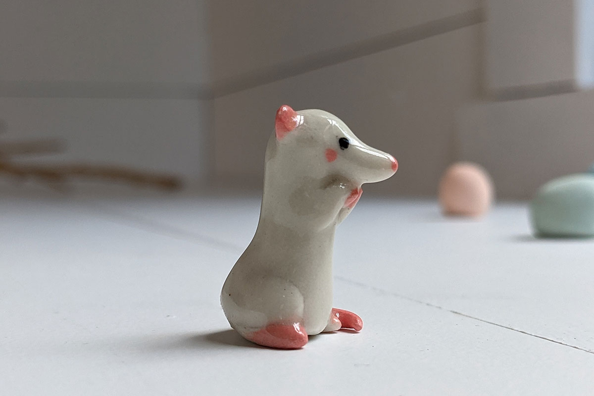 Very small Porcelain white rat with pink tail and ears. About 4 cm high, this is a unique miniature. Hand built in Montréal, Québec.