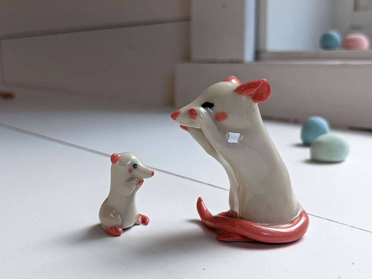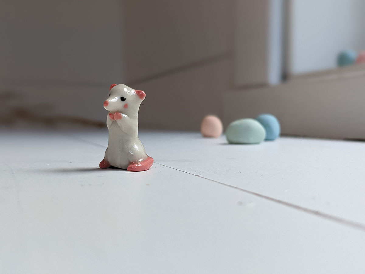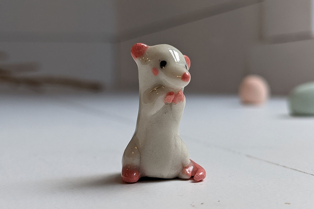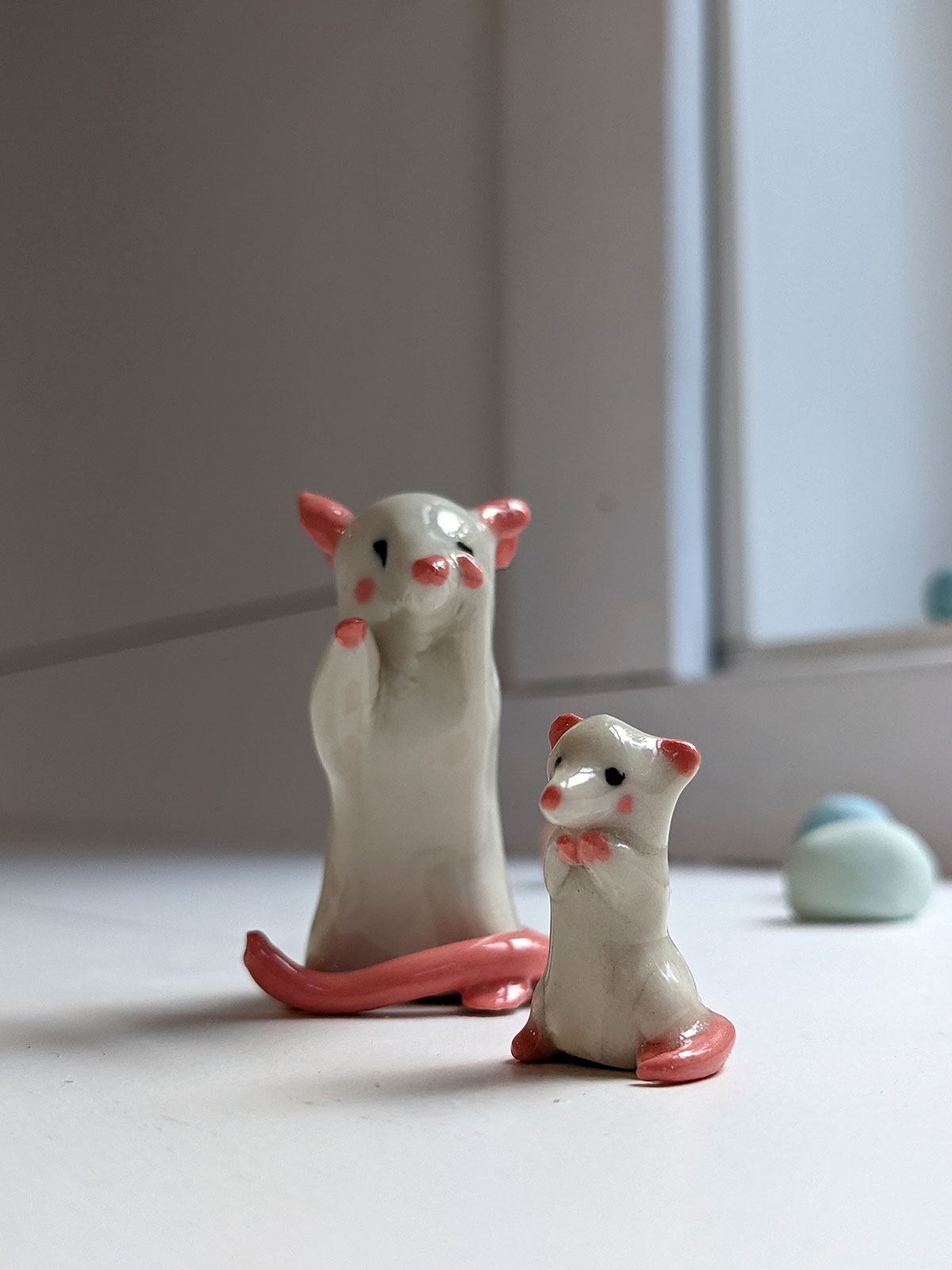 Very small Porcelain white rat with pink tail and ears. About 4 cm high, this is a unique miniature. Hand built in Montréal, Québec.