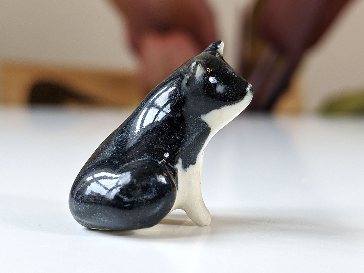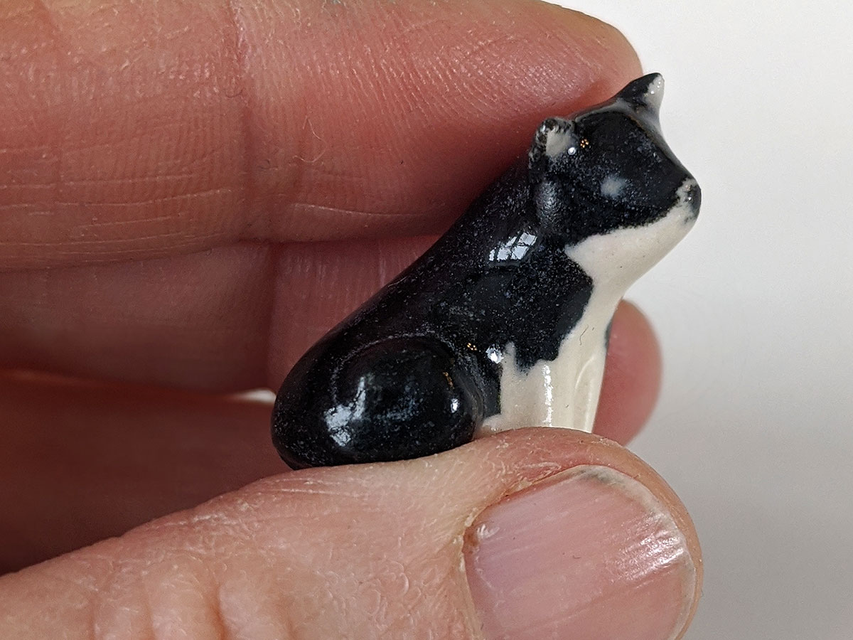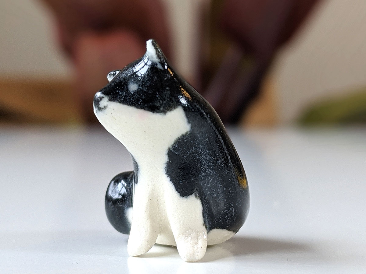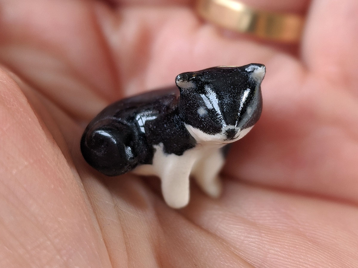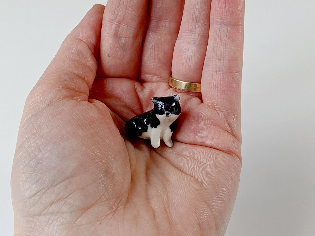 Tiny Tuxedo Cat, made with clay and love. Handsculpted in Montreal, Quebec, this little one comes in a custom box. It’s about 3,5 cm high.