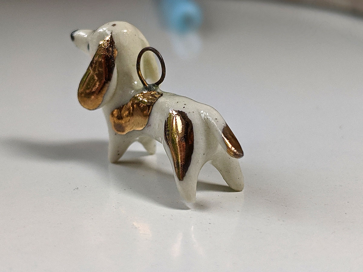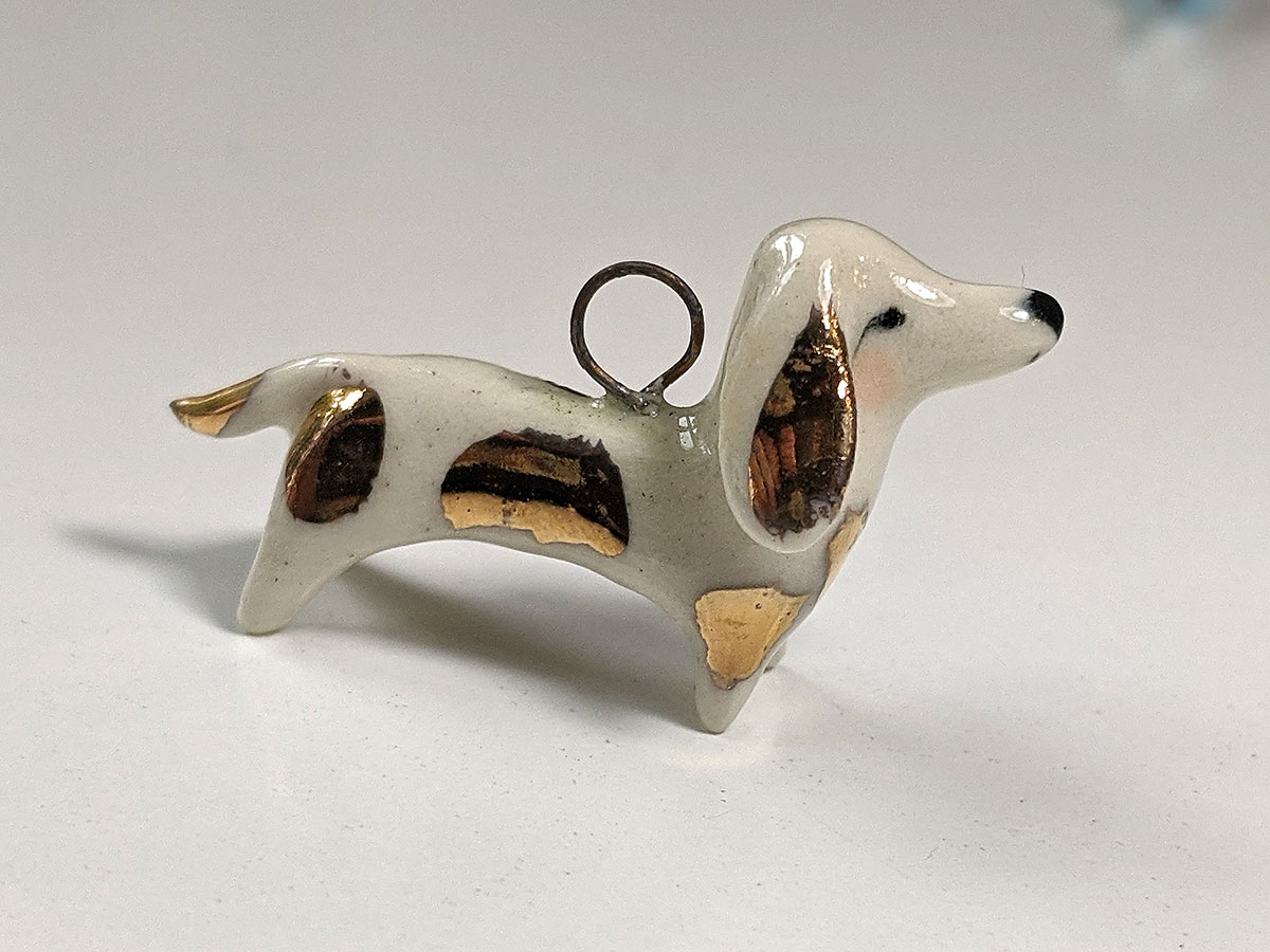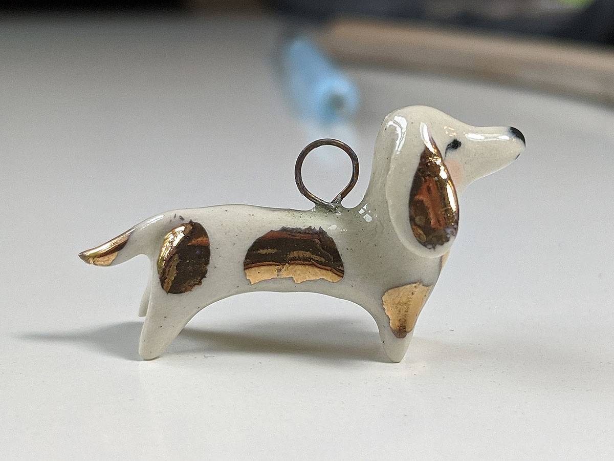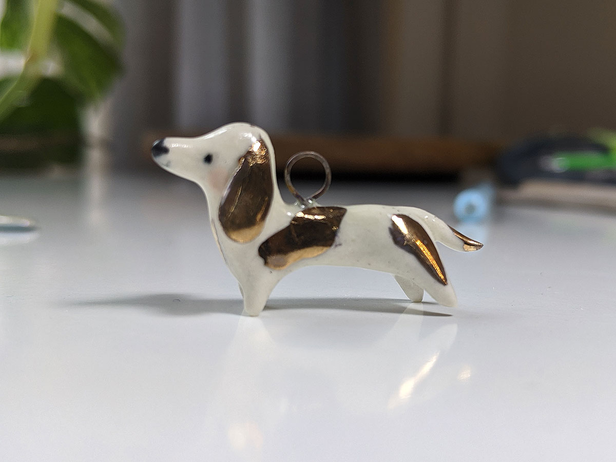 Small white daschund pendent with gold highlights. About 3 cm long, this unique piece of porcelain jewelry comes in a custom box. Shipping included.