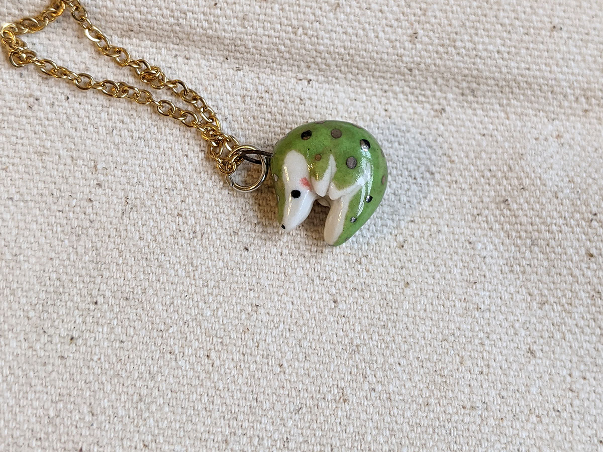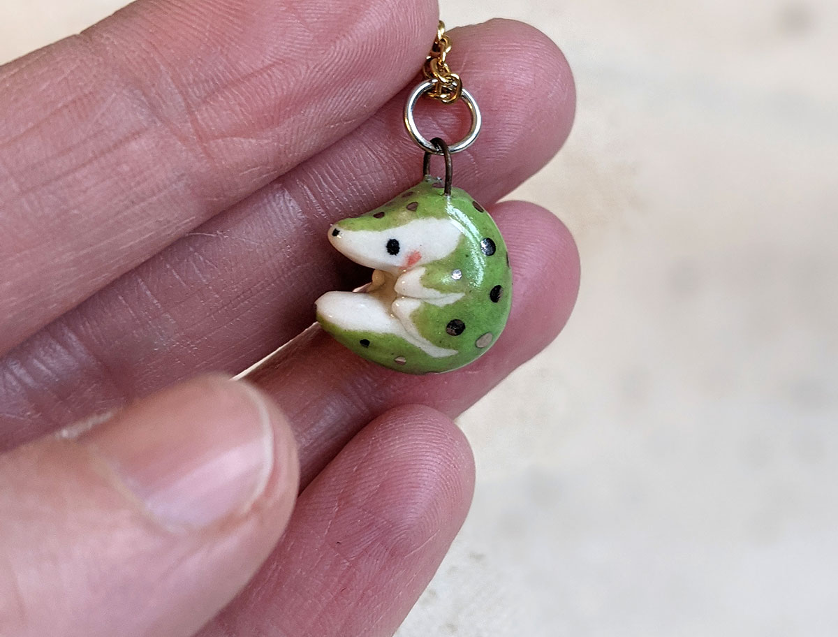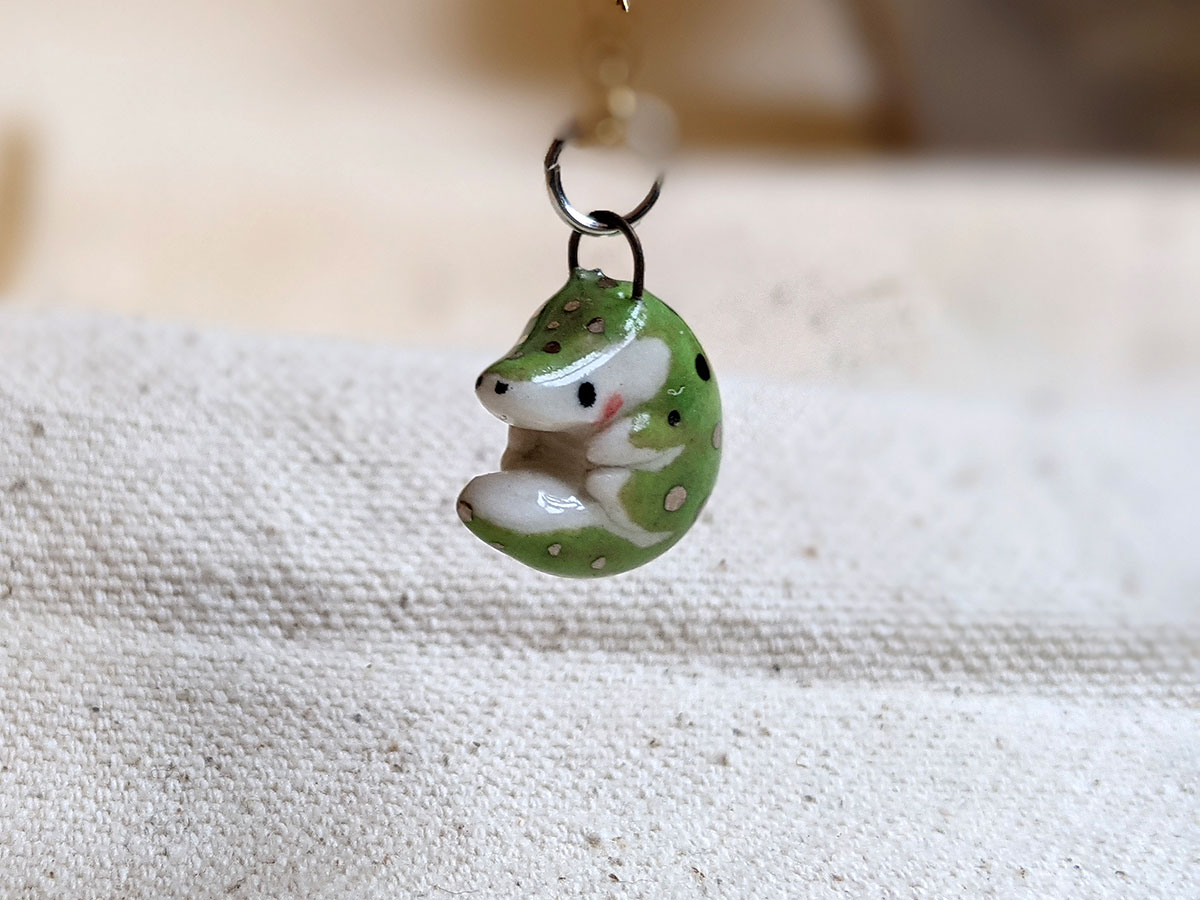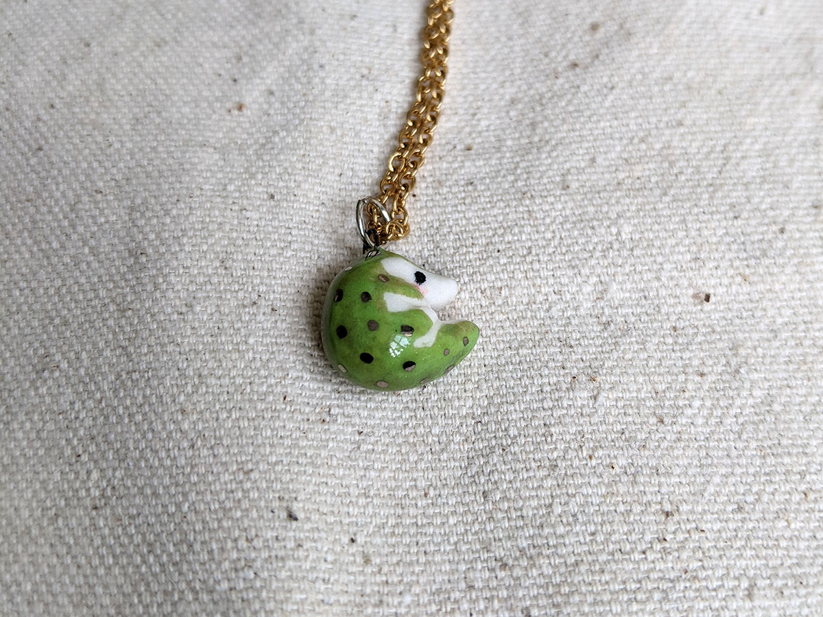Tiny crocodile pendant with a nice green shine and white gold highlights. One of a kind, this little pendant comes in an illustrated box. Chain sold separately.