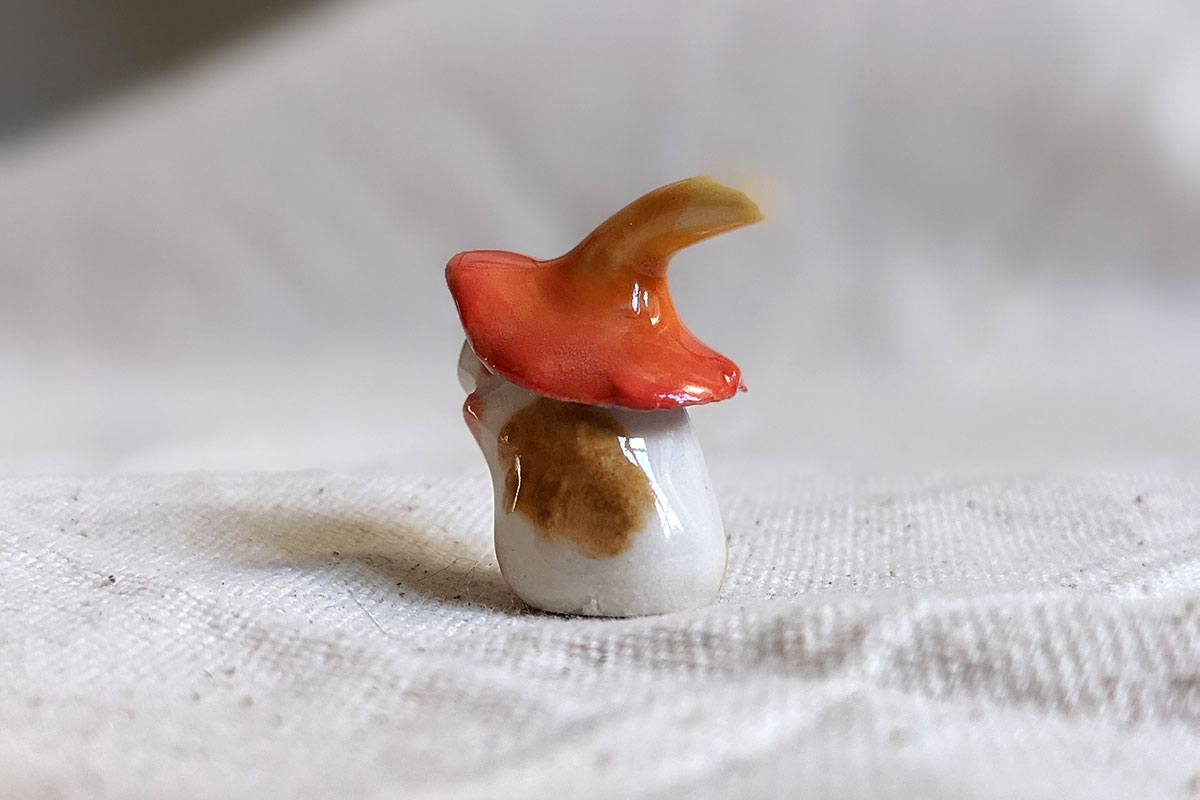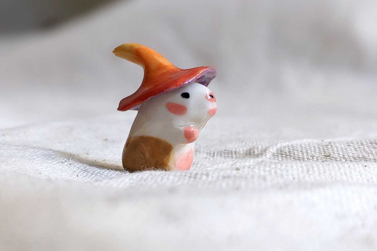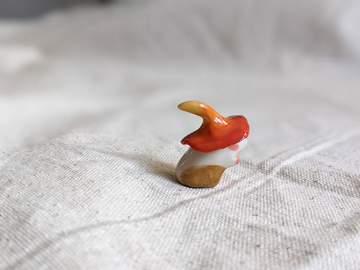 This is a handcrafted ceramics figurineabout 4-5 cm high, made in Montréal.