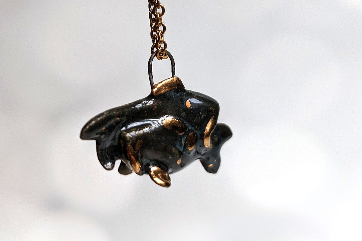 Zodiac sign porcelain pendant, with yellow gold highlights. About 2-3 cm long / wide, this piece is entirely handcrafted. Small fine gold details and stars are painted in. This one of a kind piece comes in an illustrated box.