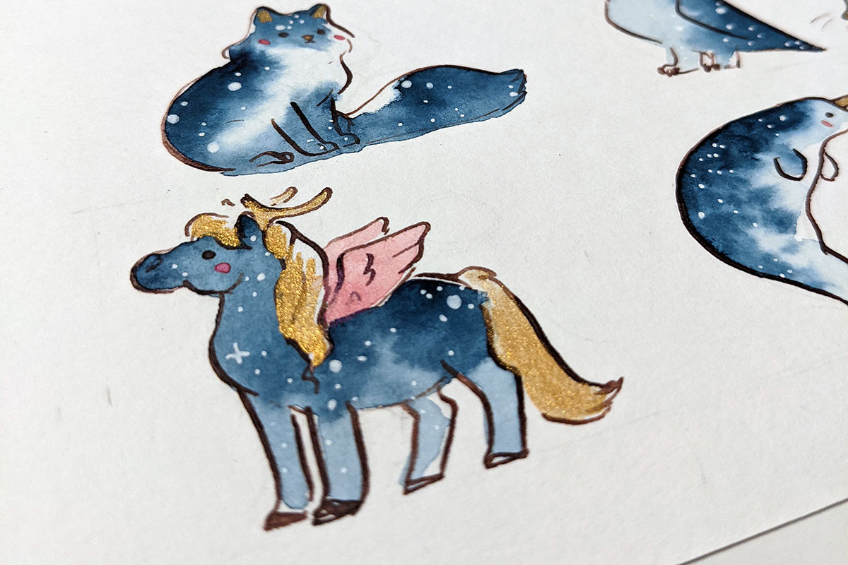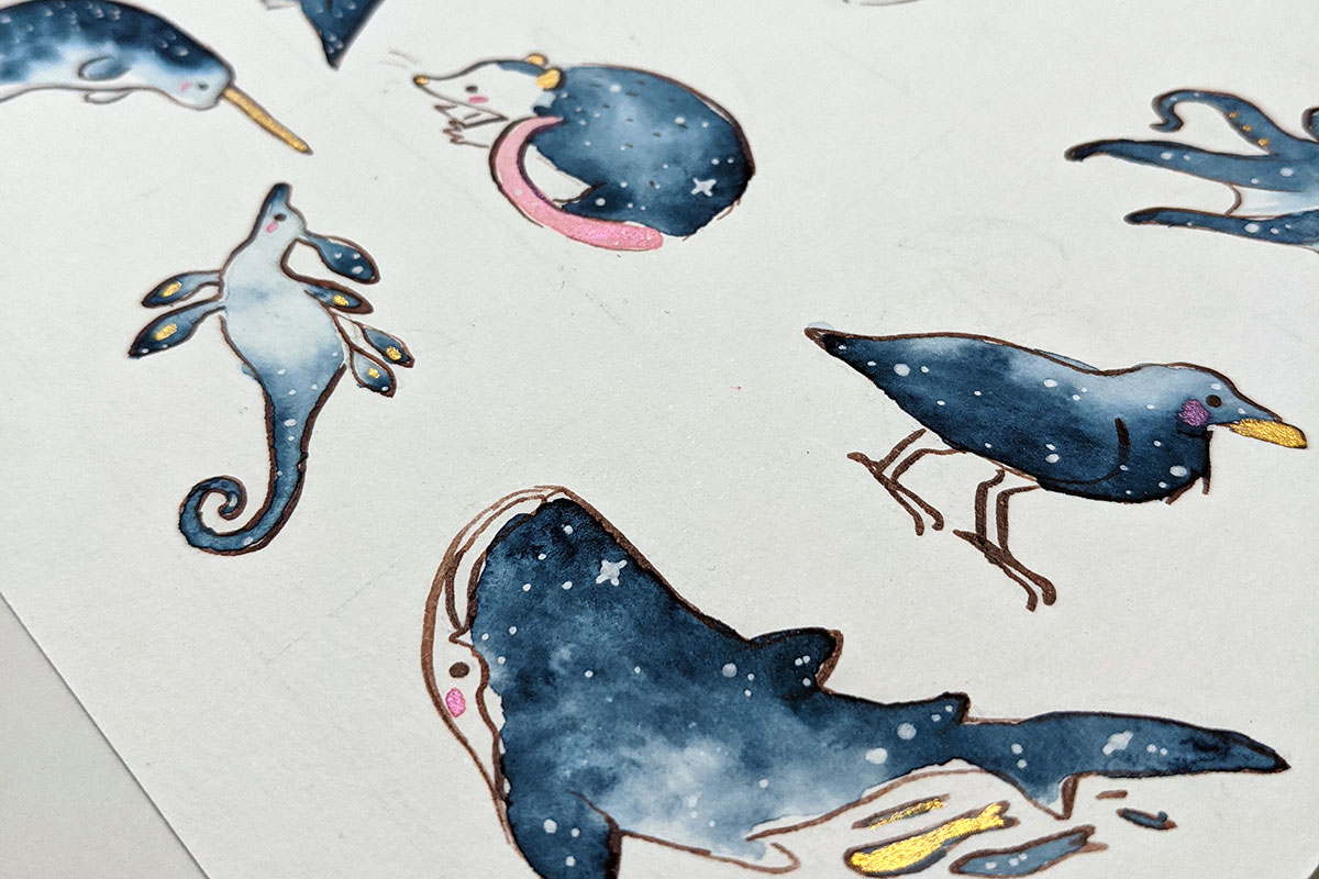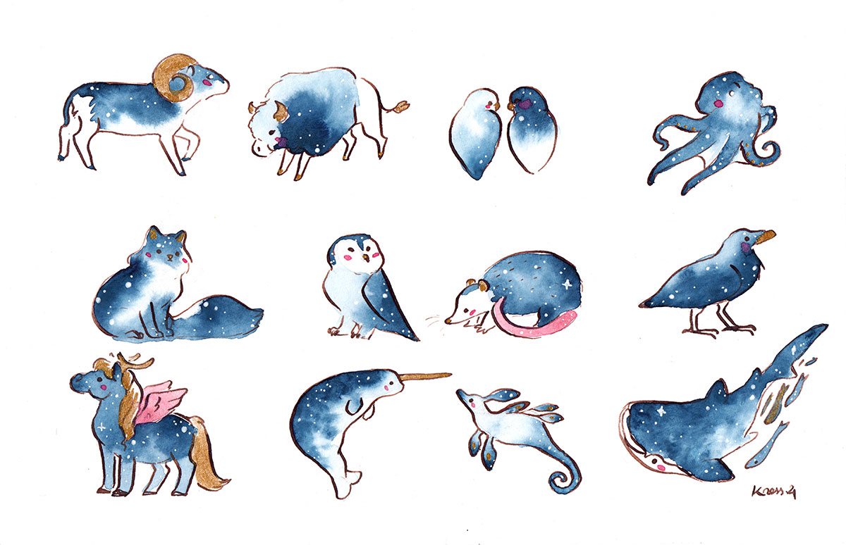 Original watercolor painting of 23 cm x 15 cm on heavy weight paper. This piece is painted with handmade watercolors from France, including gold watercolor that glitters depending on light angle, and a pearlescent pink on this one. I painted the twelve Zodiac signs in a starry night fashion, reimagining a few of them. This painting is also available as art prints and goodies. The Zodiac signs are also available as ceramics and gold pendants, each sign is a one of a kind piece of porcelain jewelry.